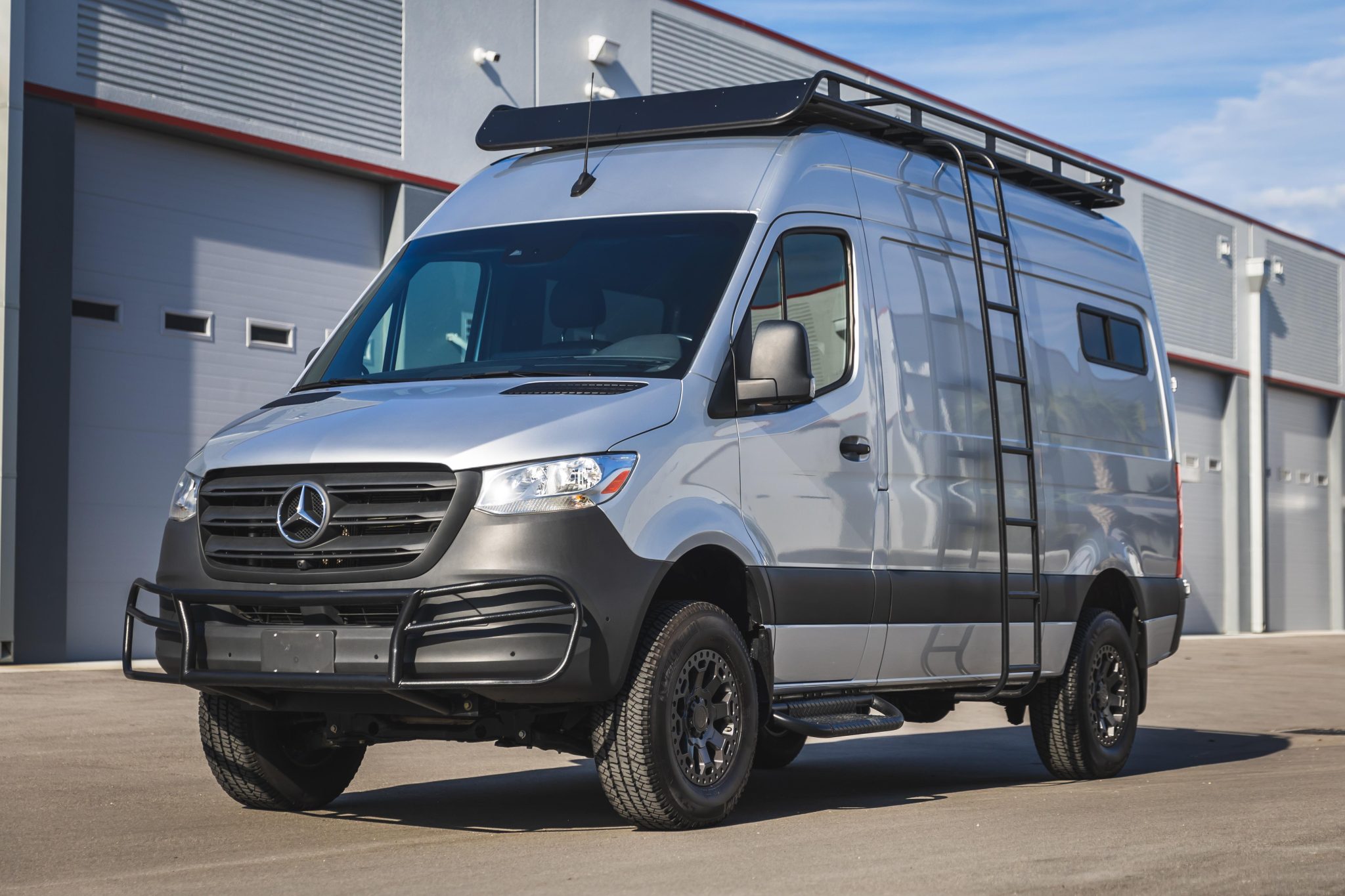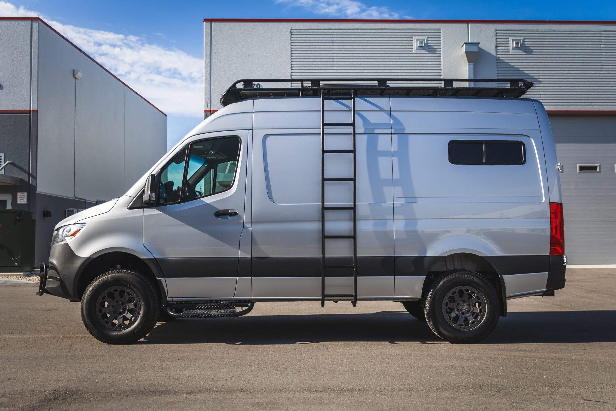 Gray-finished 17″ Black Rhino alloy wheels are mounted with 265/70 Michelin LTX A/T tires, and a spare is secured to the underbody. Stopping power is provided by four-wheel disc brakes, and the van rides on an independent front suspension system and a solid rear axle with leaf springs.