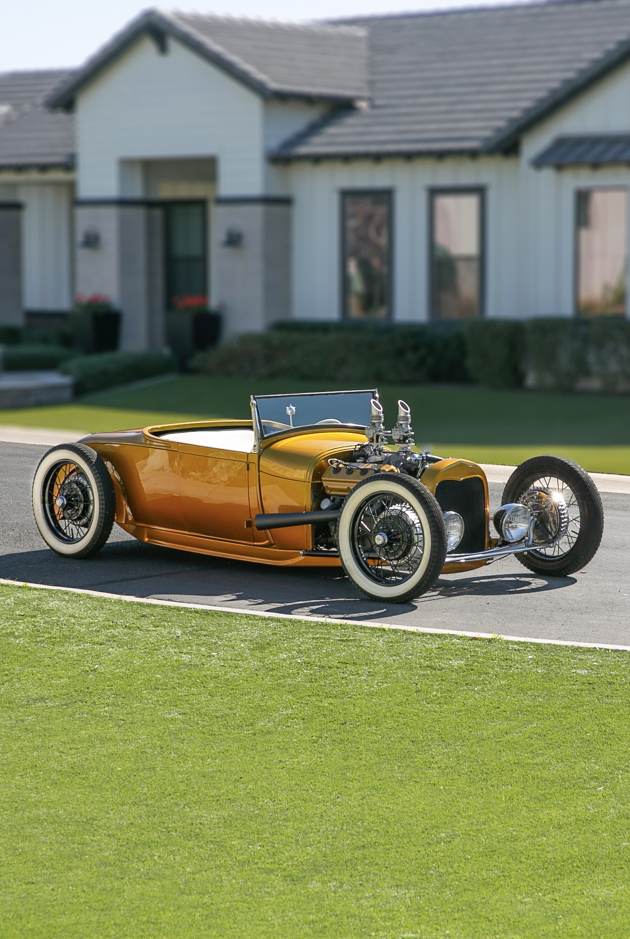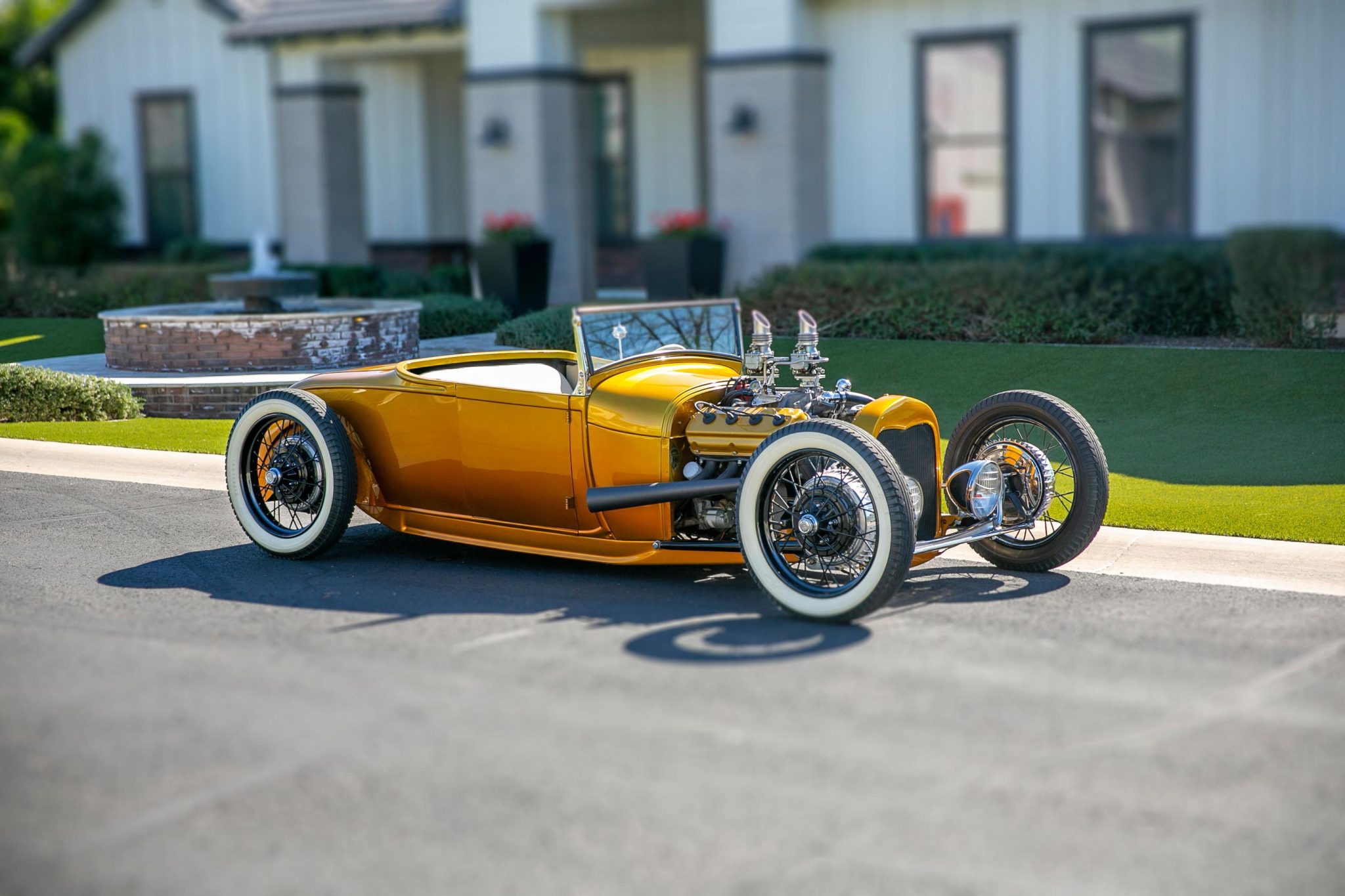 The car is equipped with Model A-style 21″ wire wheels, 4.40/4.50 Firestone gum-dipped whitewall bias-ply tires, and a dropped axle with a transverse leaf spring as well as a Flaming River steering box with a hoop-style steering arm.