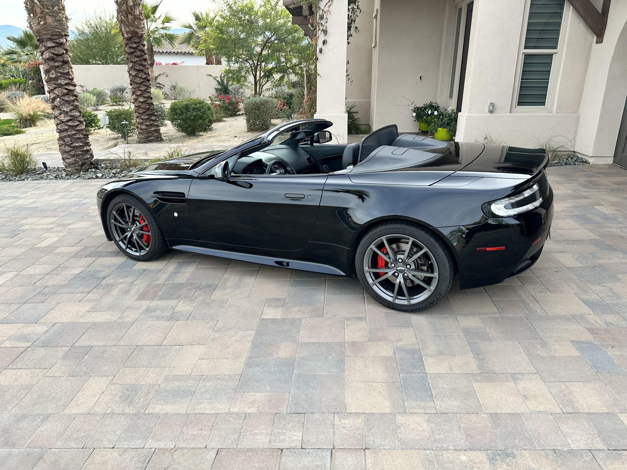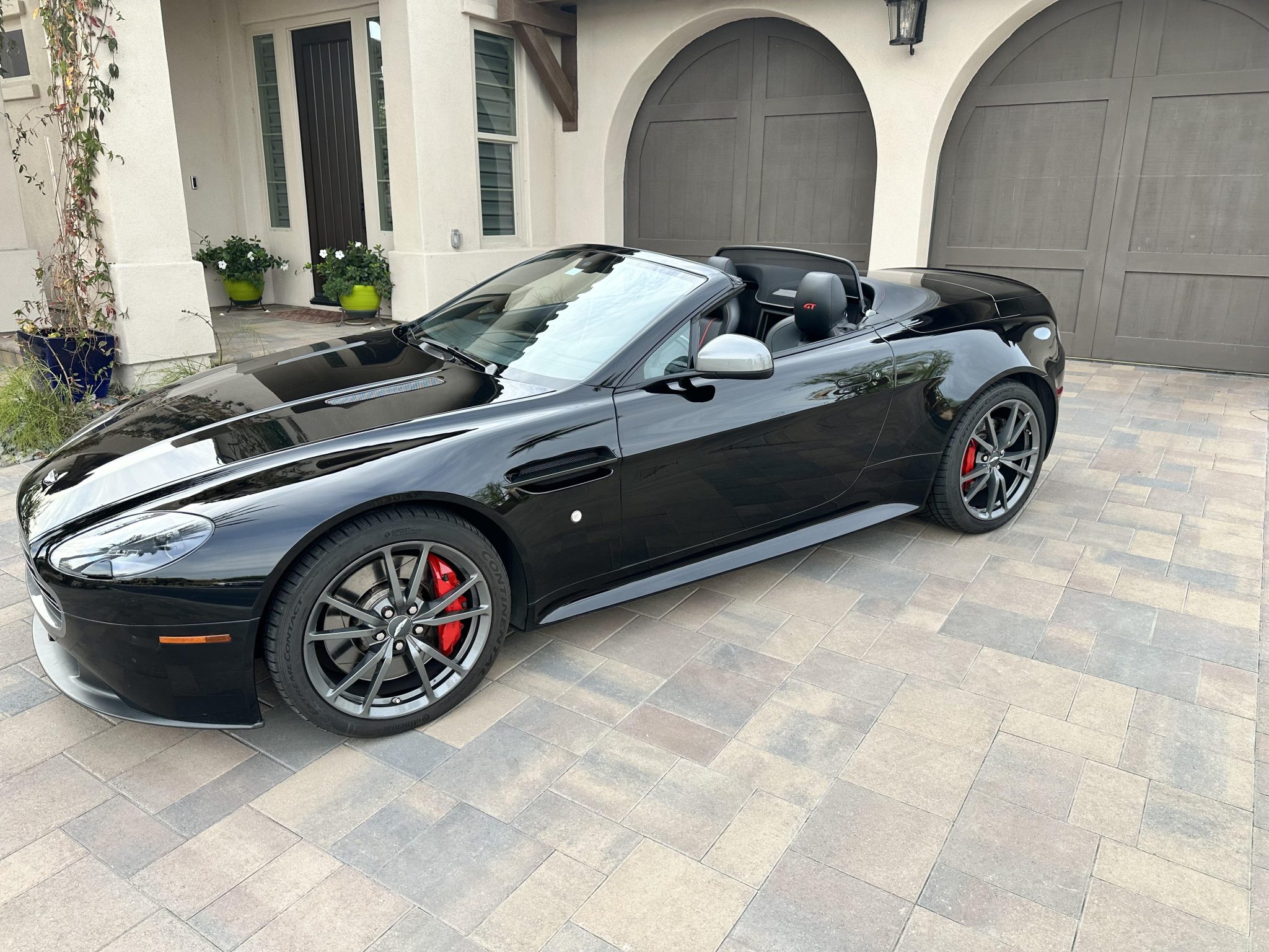Graphite-finished 19″ 10-spoke forged wheels are mounted with Continental ExtremeContact DWS06 Plus tires installed in April 2023. The GT is equipped with a re-tuned sports suspension and a quick-ratio steering rack. Braking is from Aston Martin-branded red calipers over slotted rotors at all four corners.