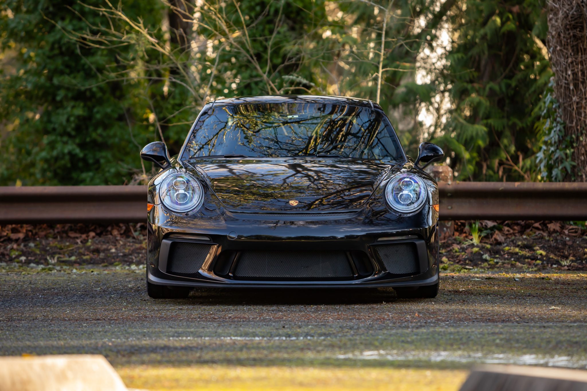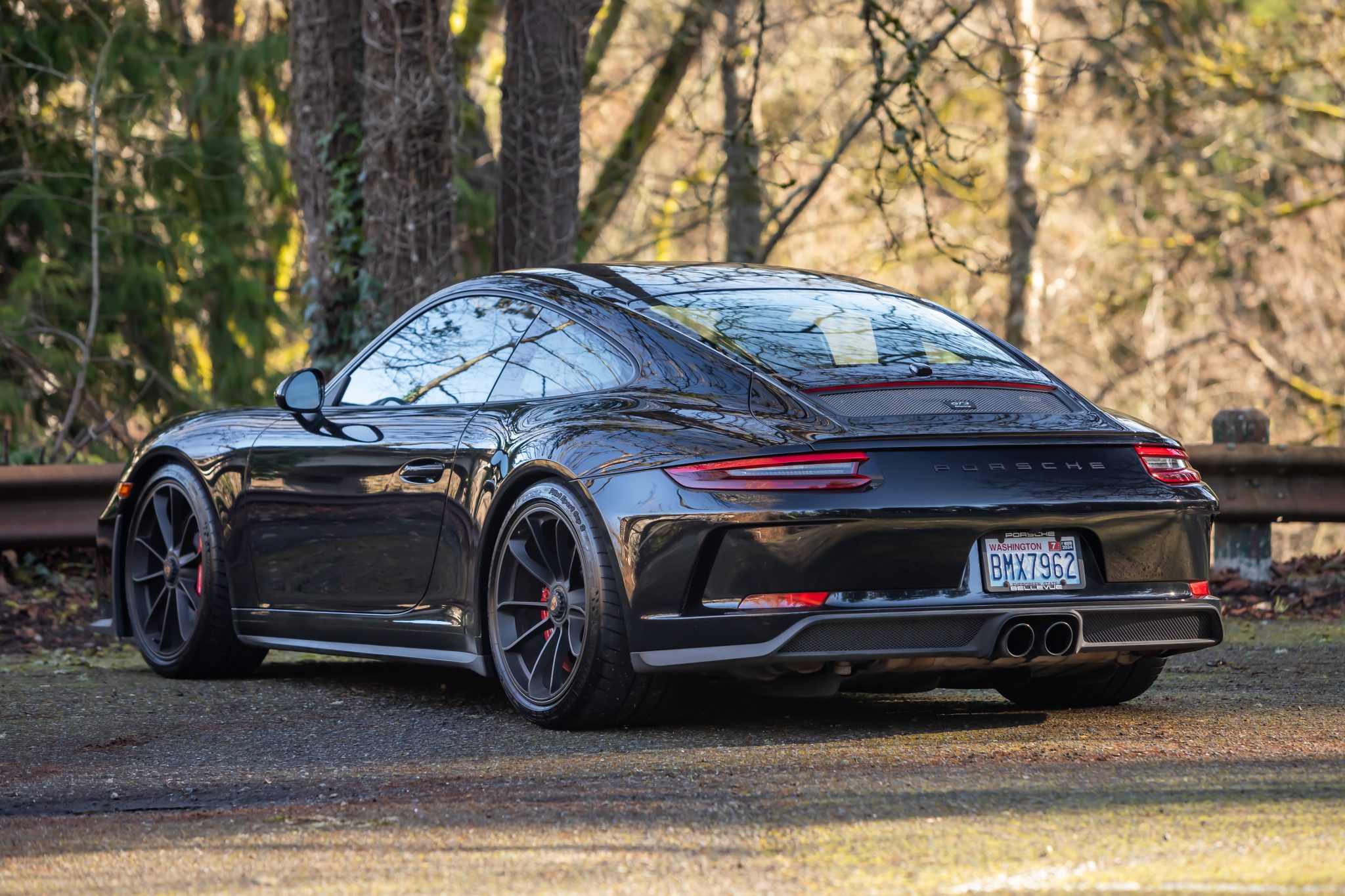 Satin Black–finished 20″ center-lock alloy wheels are mounted with Michelin Pilot Sport Cup 2 tires measuring 245/35 up front and 305/30 out back. Braking is handled by red Porsche-branded calipers over cross-drilled and ventilated discs, and the car is equipped with a front-axle lift system. The brake fluid was flushed in 2023 and a four-wheel alignment was performed in March 2024.