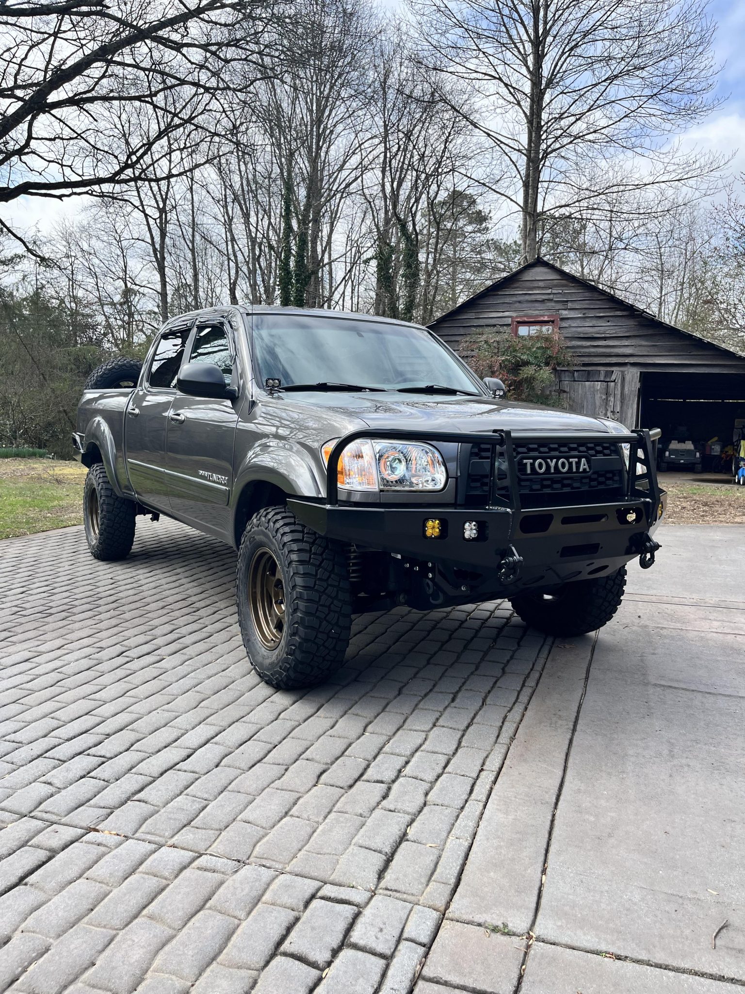 Bronze-finished 17″ SCS Gen5 alloy wheels are mounted with 285/75 BFGoodrich Mud-Terrain T/A KM3 tires. The suspension is modified with adjustable ADS front coilovers and rear shocks, JBA front upper control arms, Solo Motorsports front lower control arms, a Deaver rear leaf pack, an Archive Garage rear shock relocation kit and Hammer Hangers, and MAXXLinks sway bar end links. The braking system has been retrofitted with larger front disc brake components sourced from a 2010+ Lexus GX460 featuring custom-milled rotors, and the factory rear drums are retained. The steering rack and lower ball joints were replaced under current ownership.