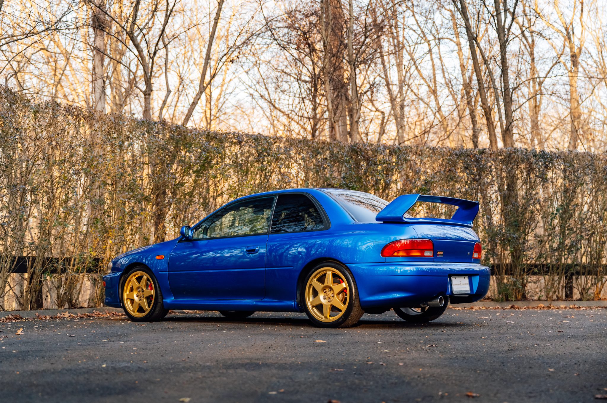 The gold-finished 18″ Speedline wheels wear faded Speedline Corse and Prodrive branding. Continental ExteremeContact Sport O2 tires measuring 235/45 were mounted in 2023. An STi/ Fuji Heavy Industries carbon-fiber strut brace spans the engine bay, and stopping power is provided by red-finished Subaru-branded calipers over vented discs. The front brake rotors and pads were also replaced in 2023.