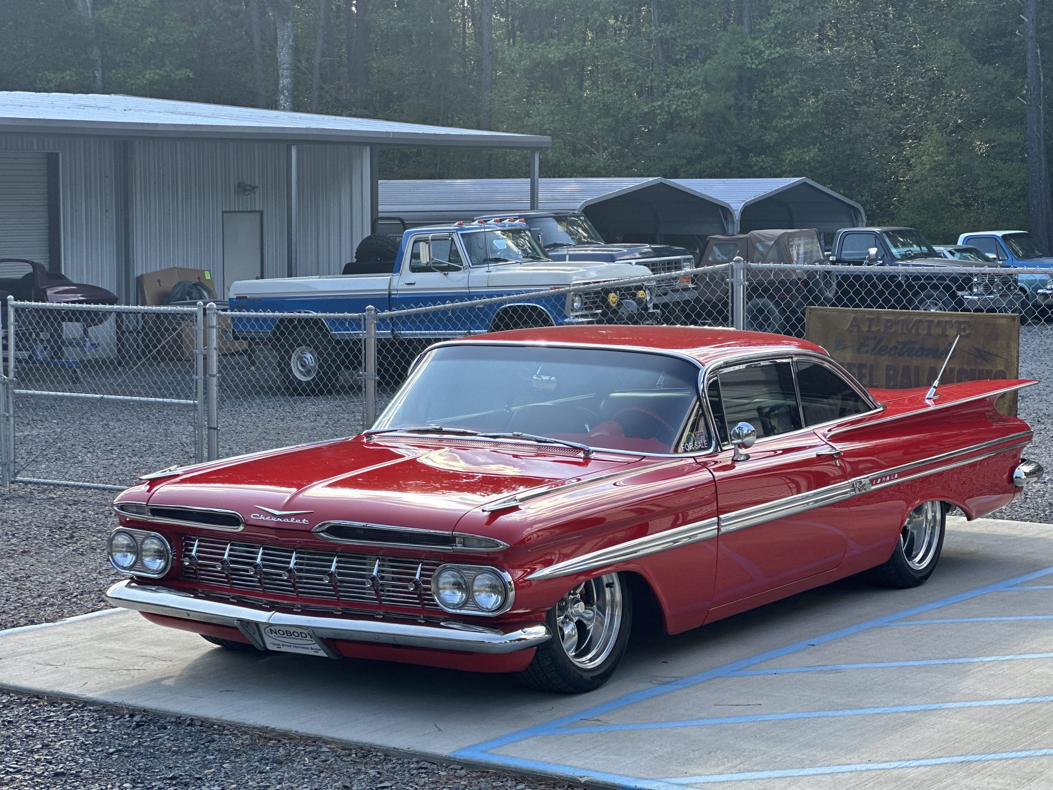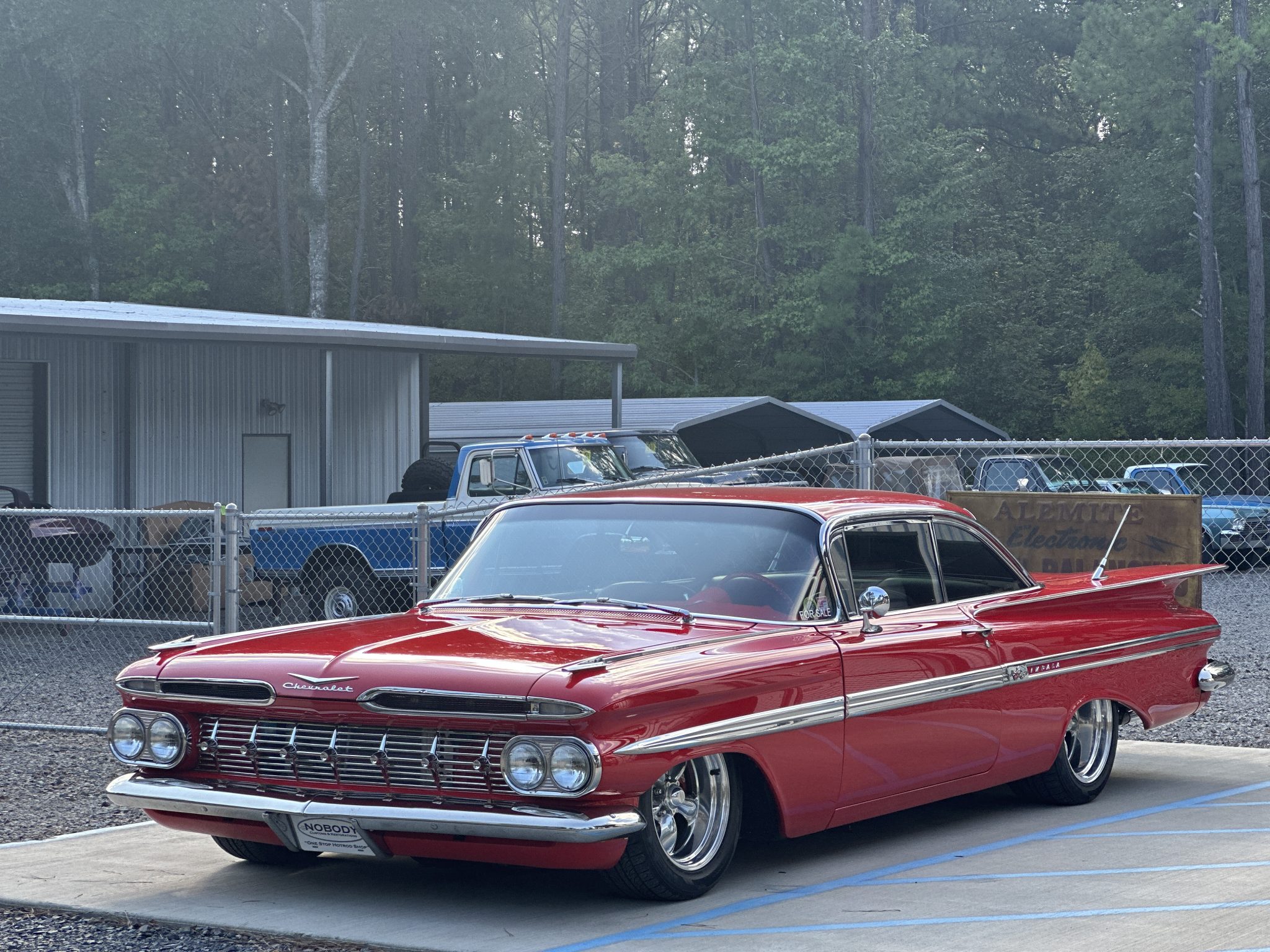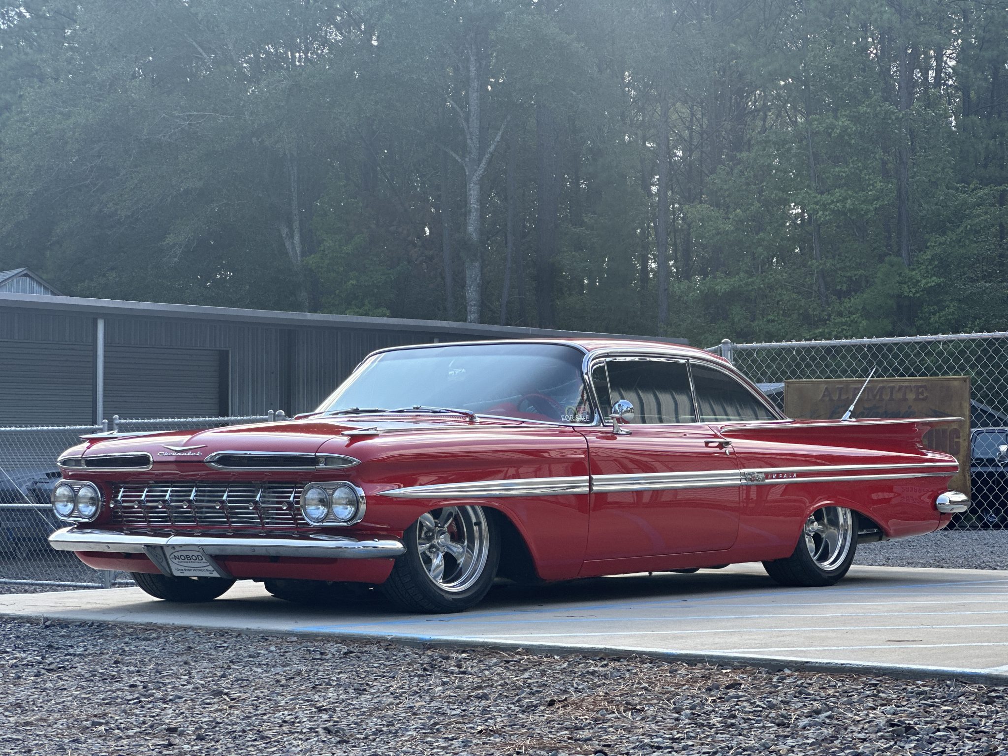 American Racing Torq Thrust 17″ wheels are mounted with staggered-width Nexen N7000 tires. A RideTech air suspension system and aftermarket control arms are fitted, and the car is equipped with power steering. Stopping power is provided by power-assisted four-wheel disc brakes with CCP calipers over cross-drilled and slotted rotors.