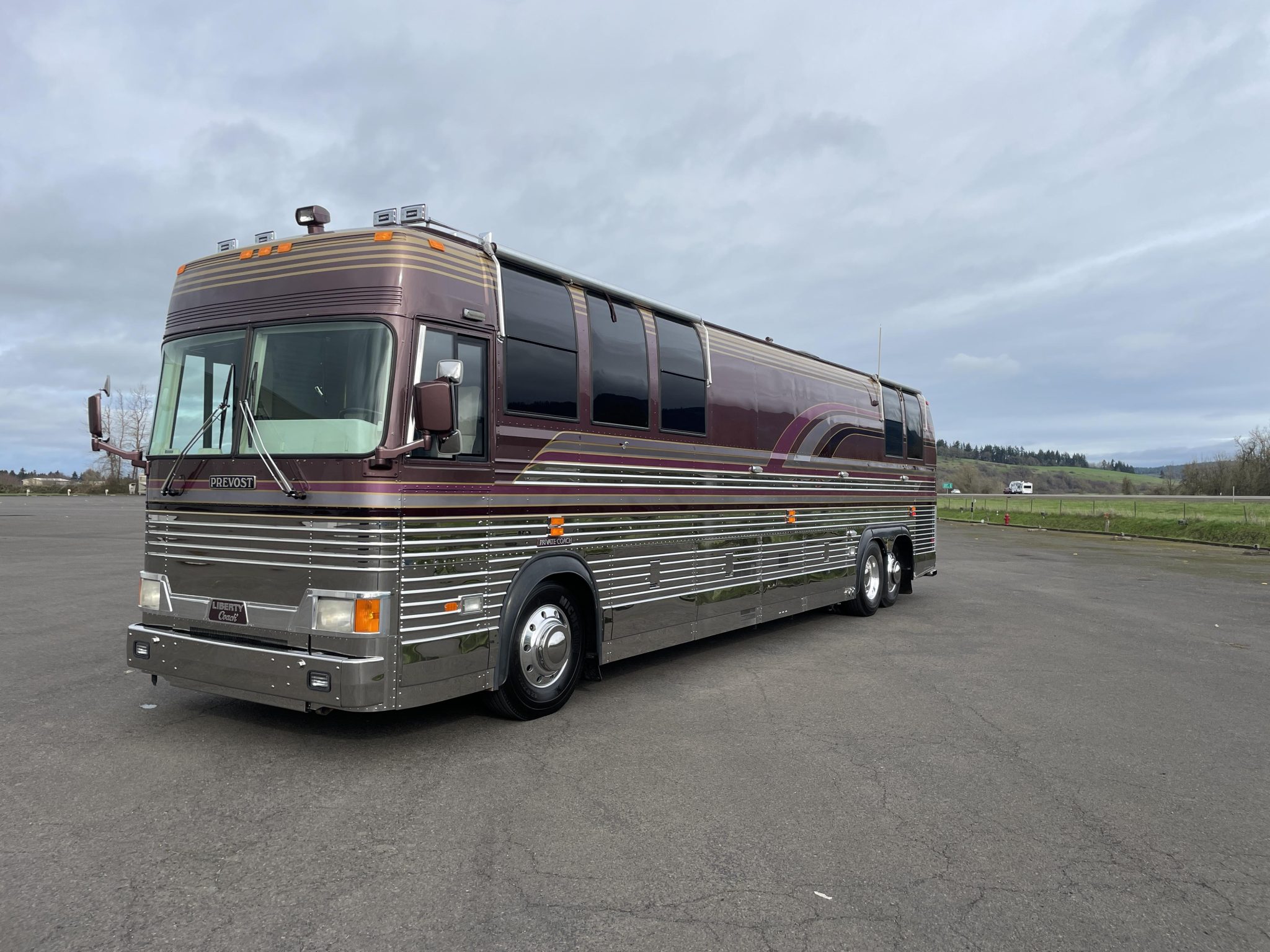 Polished 22.5″ alloy wheels wear 12R22.5 Michelin XZE tires, and stopping power is from air-actuated drum brakes. Infrastructure features include a Power Tech diesel-fueled generator, a Raritan marine water heater, freshwater and waste tanks, Pentair inline water filters, and shore connections for water, waste disposal, and electrical service. Work performed during the refurbishment included repairing electrical wiring, rerouting the freshwater fill line, and replacing the tank sensors and power inverters as well as the house, chassis, and generator batteries. The vehicle measures approximately 480″ long, 102″ wide, and 137″ tall and weighs around 25,000 pounds.