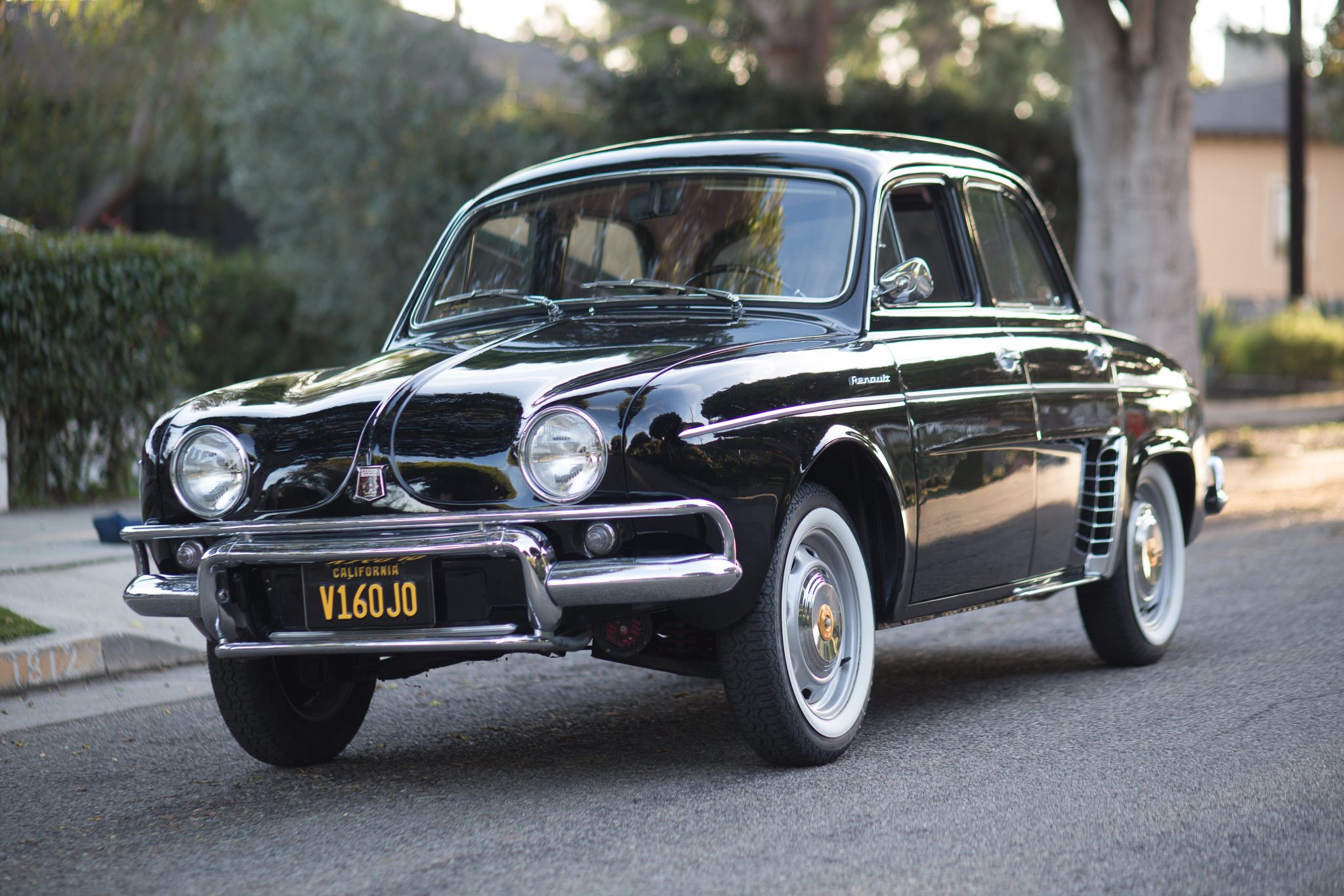Silver-finished 15” steel wheels wear chrome hubcaps accented in gold, and whitewall inserts have been added to the 145-series Kleber radial tires. Four-wheel disc brakes were added under prior ownership. Cracks are visible in the tire sidewalls, and the car is not equipped with a spare tire.