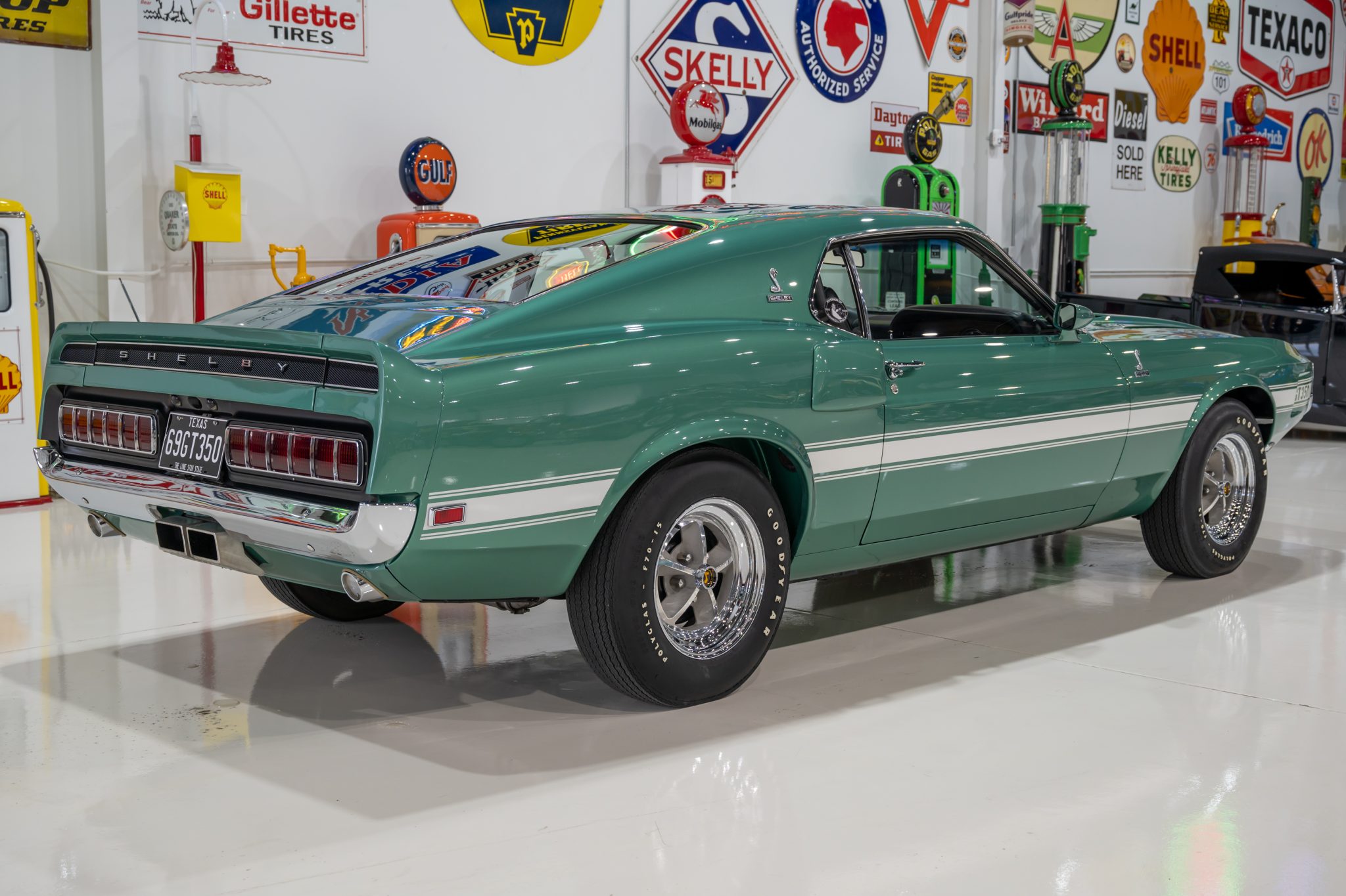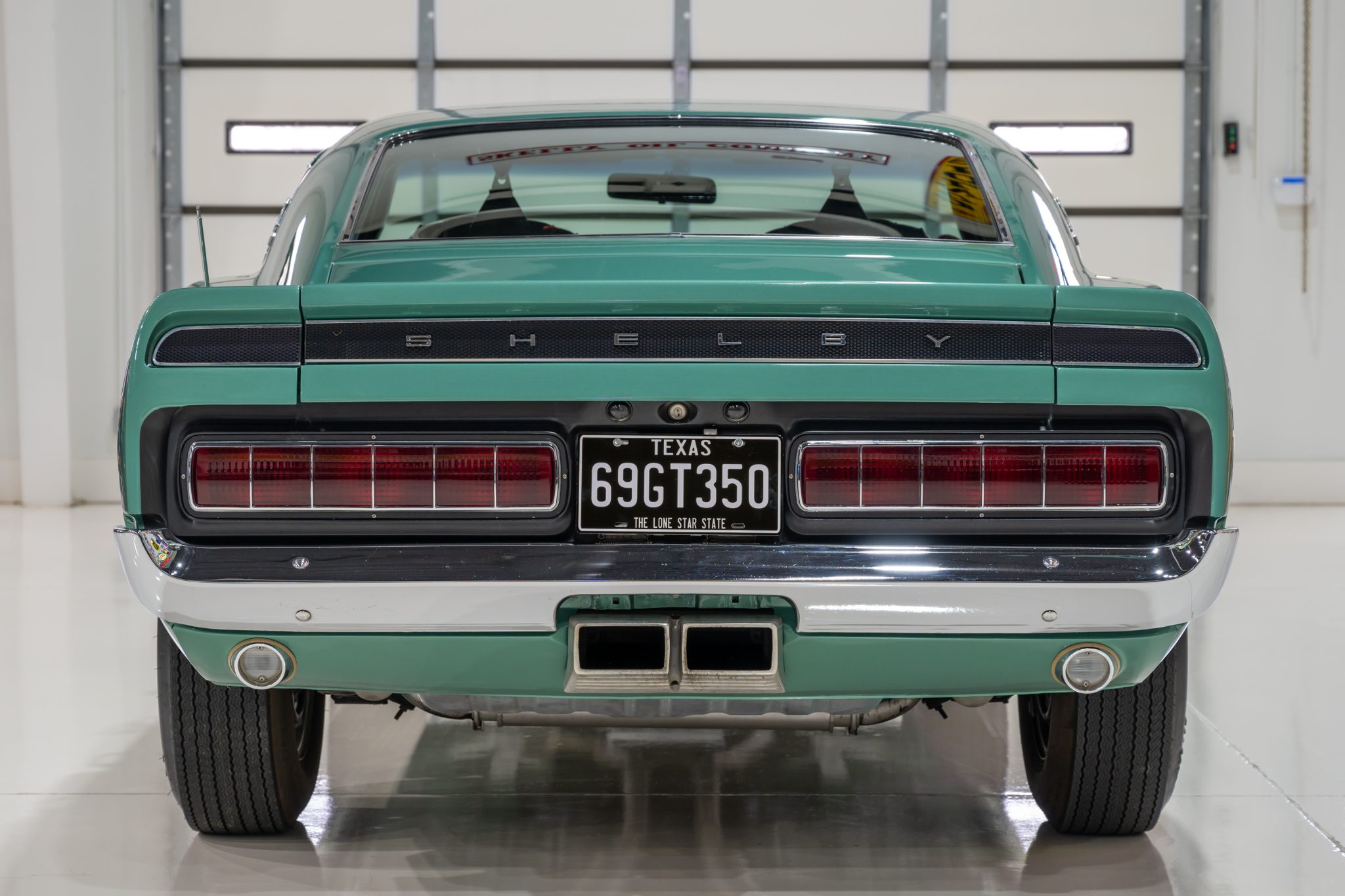Gray 15″ five-spoke Shelby wheels feature polished lips and black Shelby center caps, and they are mounted with Goodyear Polyglas F70–15 bias-ply tires. A steel spare wheel with a space-saver spare is stowed in the trunk. Power-assisted steering and front disc brakes were optioned from the factory.
