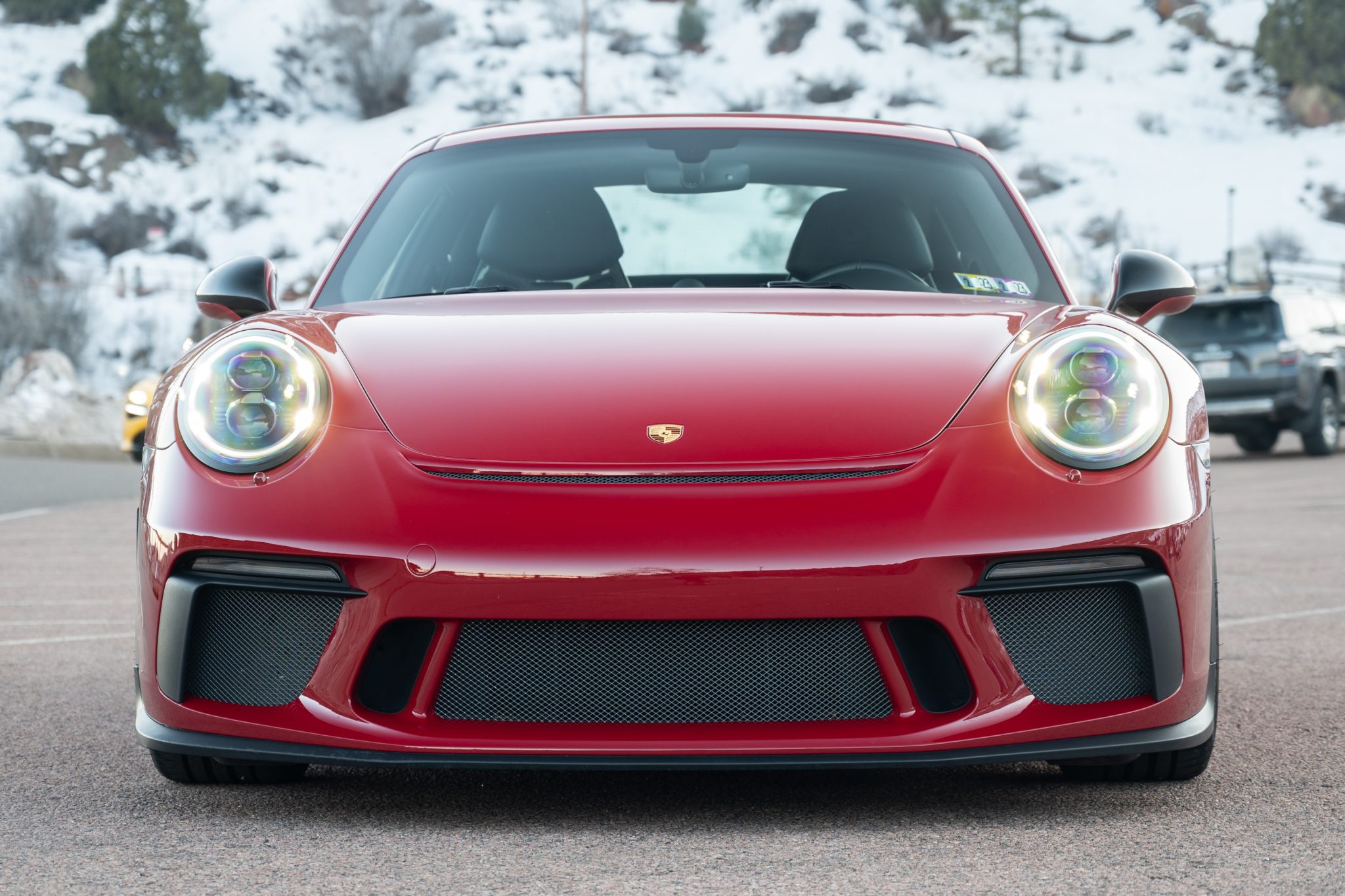 The Signature Performance 20″ SV104 forged center-lock wheels are mounted with 245/35 front and 305/30 rear Michelin Pilot Sport 4s tires showing 2020 and 2022 date codes. Braking is handled by red Porsche-branded calipers over dimpled and ventilated discs, and the car is equipped with a front-axle lift system. The brake fluid was flushed in October 2023.