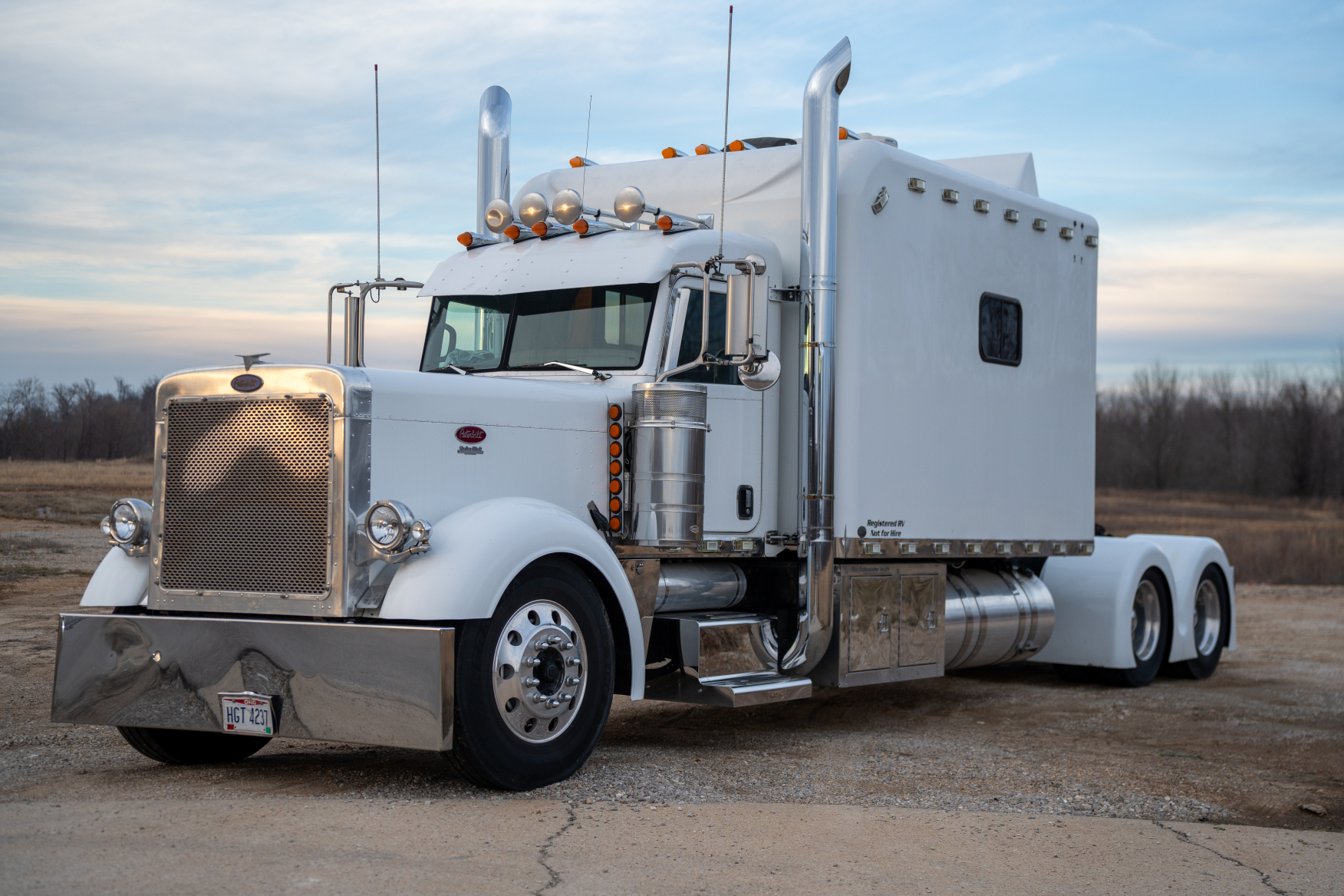 Polished 24.5″ wheels wear a mixed set of 11R24.5 tires, and the rear-wheel center caps show rust. Stopping power is from air-actuated brakes, and the truck is equipped with an air-adjustable suspension system. The selling dealer notes that the truck weighs approximately 24k pounds and has a 312″ wheelbase.