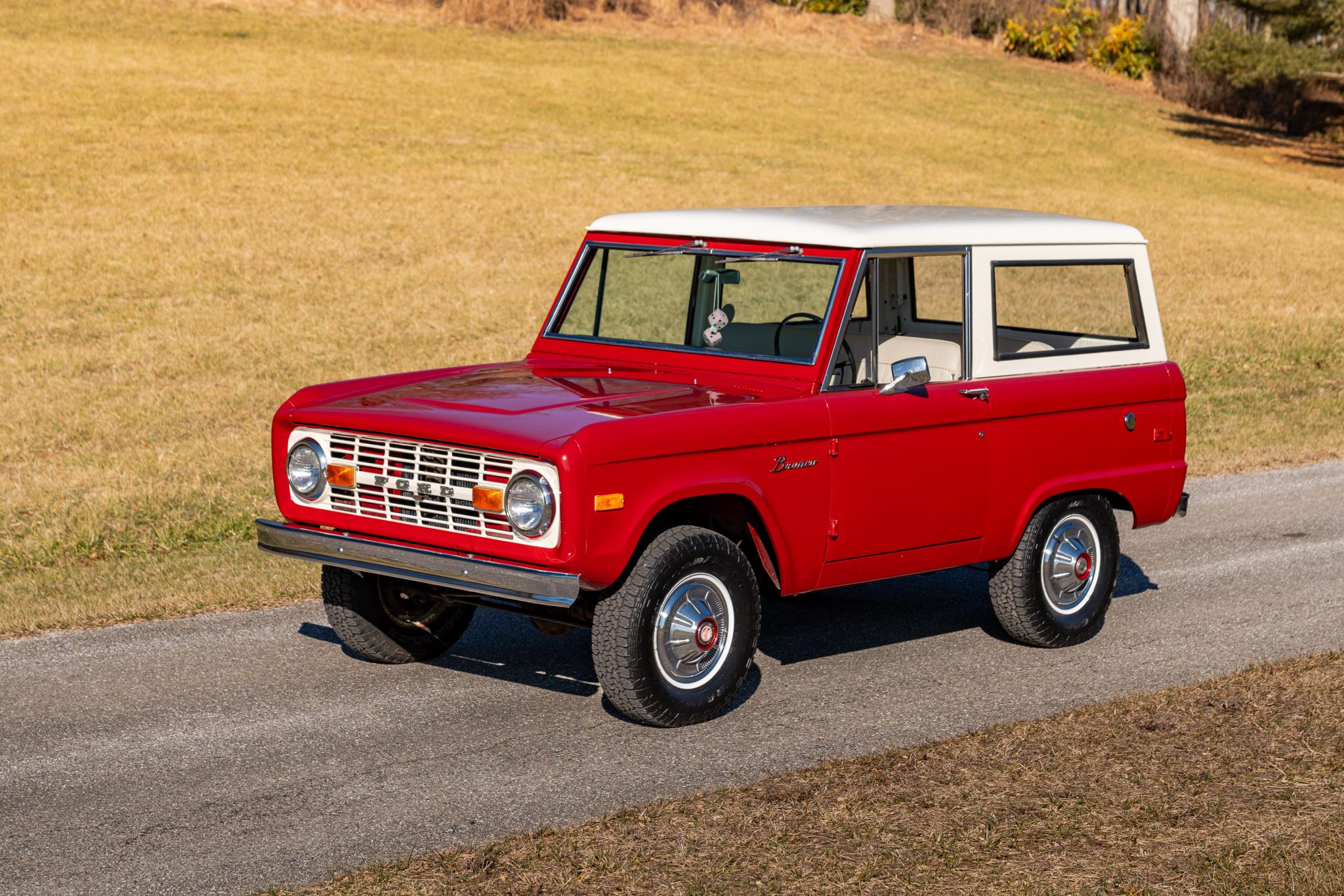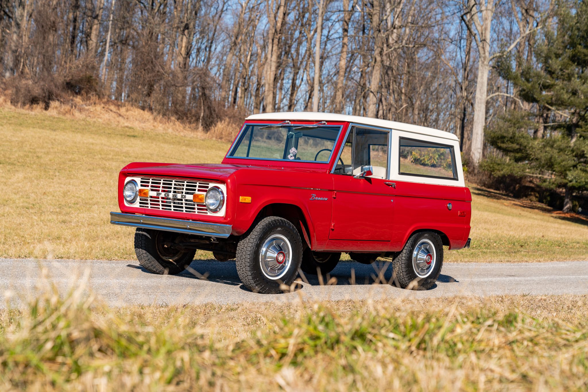 White-finished 15″ steel wheels with full covers are fitted over manually locking front hubs and wear 235/75 Goodyear Wrangler Trailrunner AT tires. Stopping power is provided by drums at each corner.