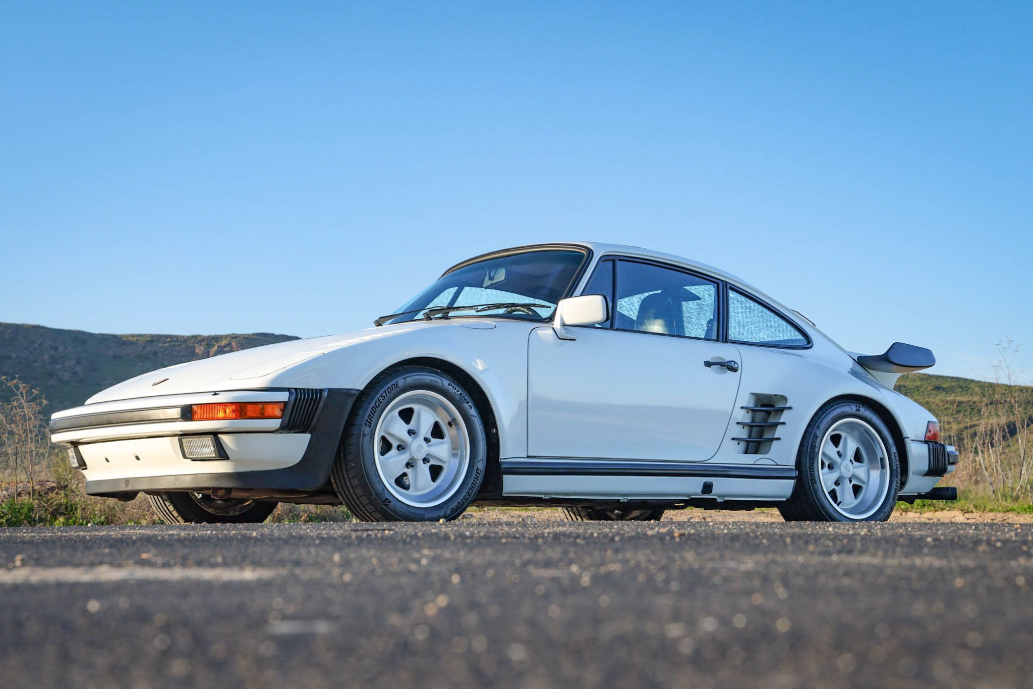 Fuchs 16″ wheels with body-color centers are mounted with 205/55 front and 245/45 rear Bridgestone Potenza Sport tires that were installed under current ownership. The four-wheel disc brakes feature Porsche-branded calipers and drilled rotors all around. There are curb marks on the right-rear wheel.