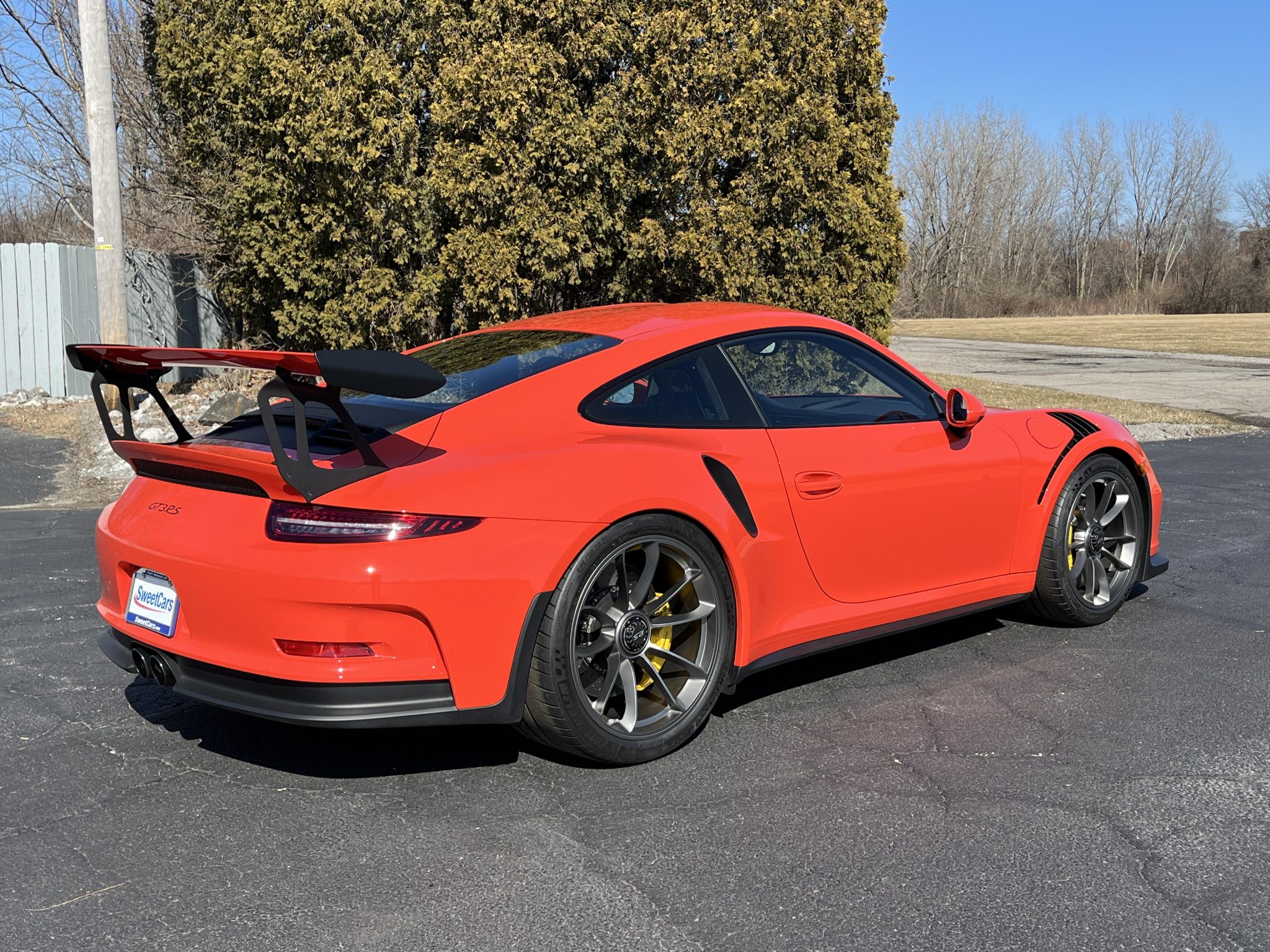 The 20″ and 21″ center-lock alloy wheels are mounted with 265/35 front and 325/30 rear Michelin Pilot Sport Cup 2 tires showing 2015 date codes. Braking is handled by yellow Porsche-branded calipers over ceramic-composite rotors. Standard GT3 RS equipment included rear-axle steering, Porsche Active Suspension Management, and Porsche Torque Vectoring Plus.