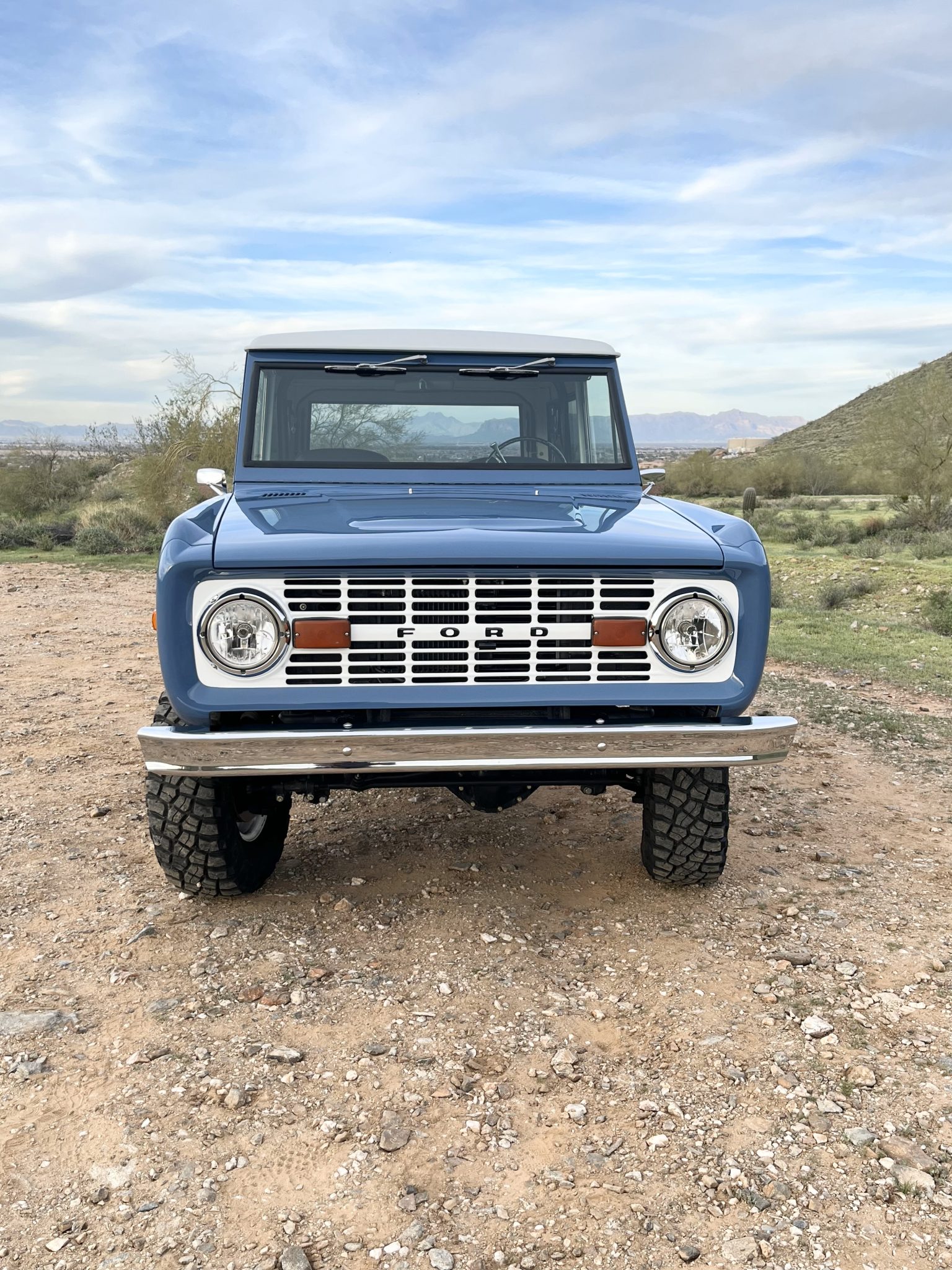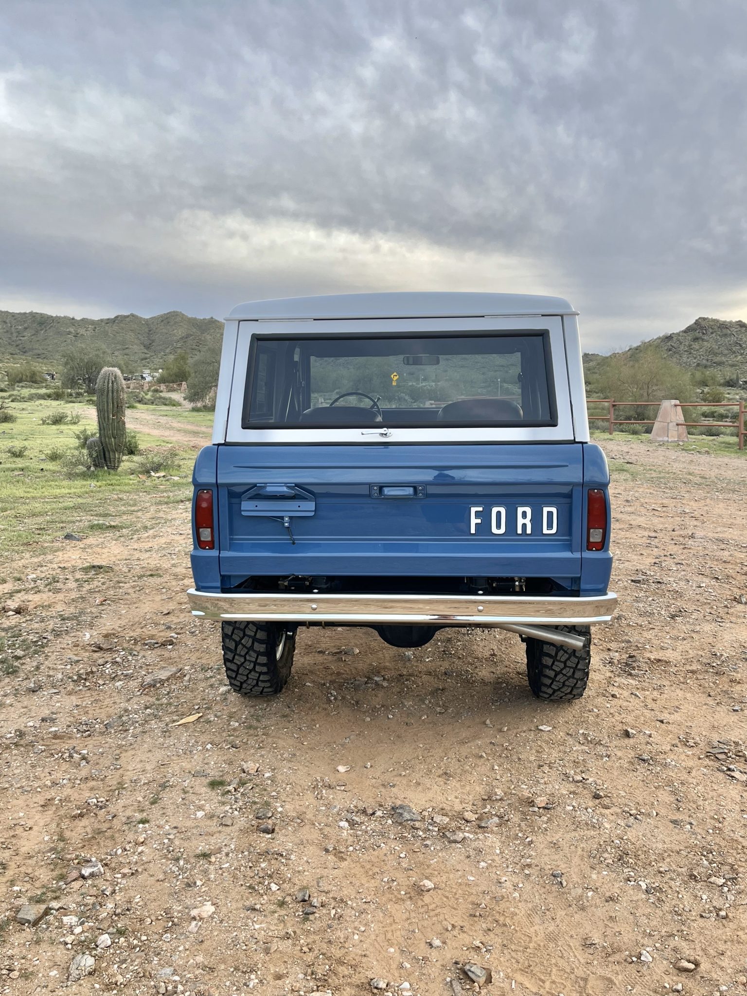 White-finished 15″ steel wheels are mounted with 31×10.50″ BFGoodrich Mud-Terrain T/A KM3 tires. The truck rides on a lifted suspension with Bilstein shocks and Wild Horses springs, and it is equipped with power steering, manually locking front hubs, and power-assisted front disc brakes. Work in December 2022 reportedly included installing upgraded front steering knuckles and power disc brakes. The rear brakes, including replacement drums and wheel cylinders, were overhauled in November 2023