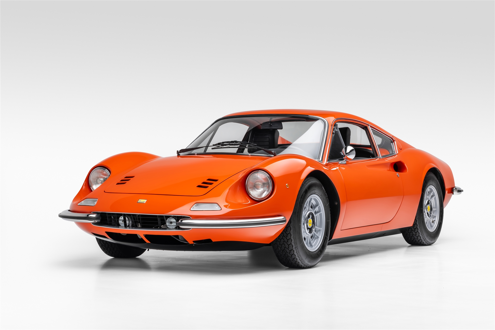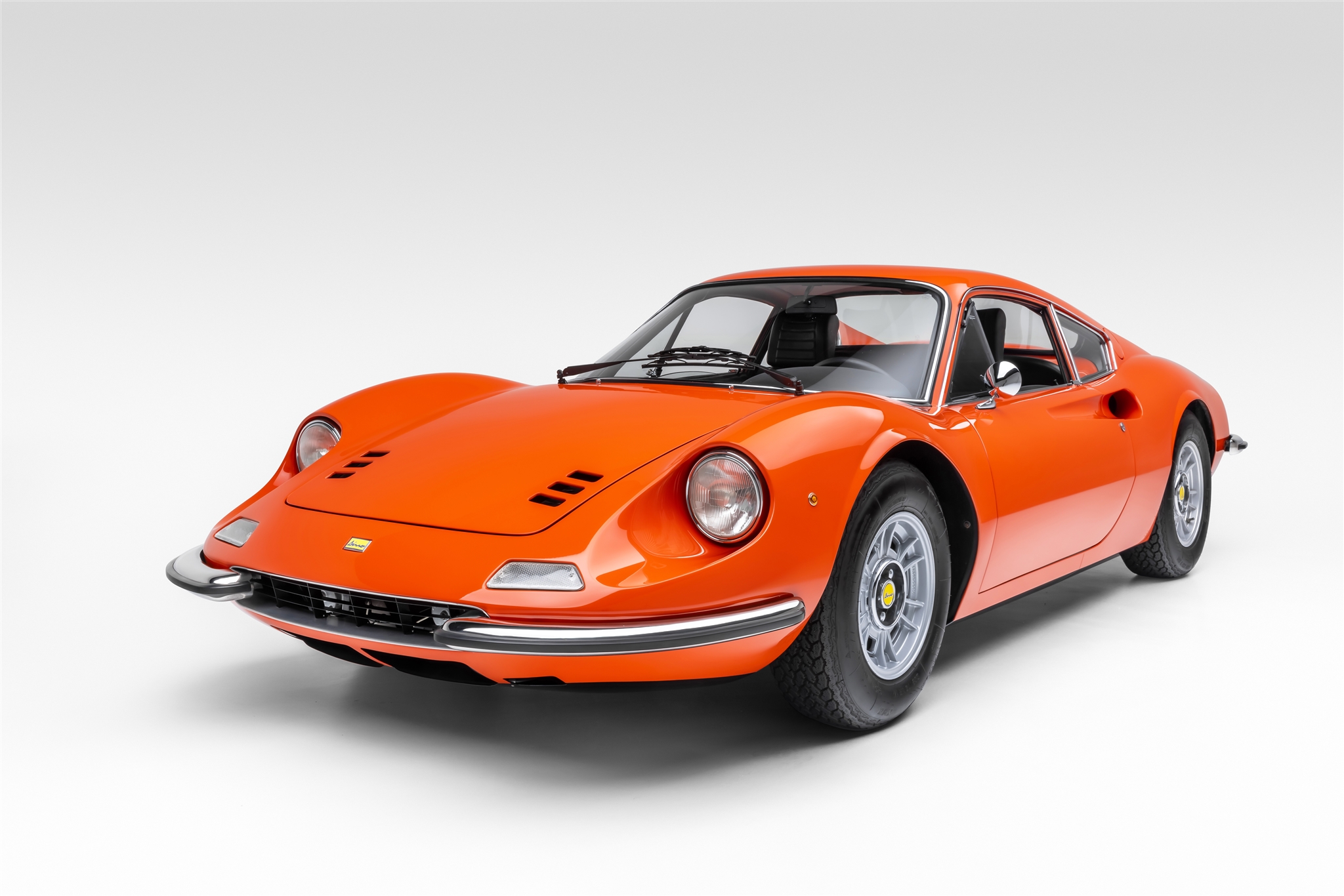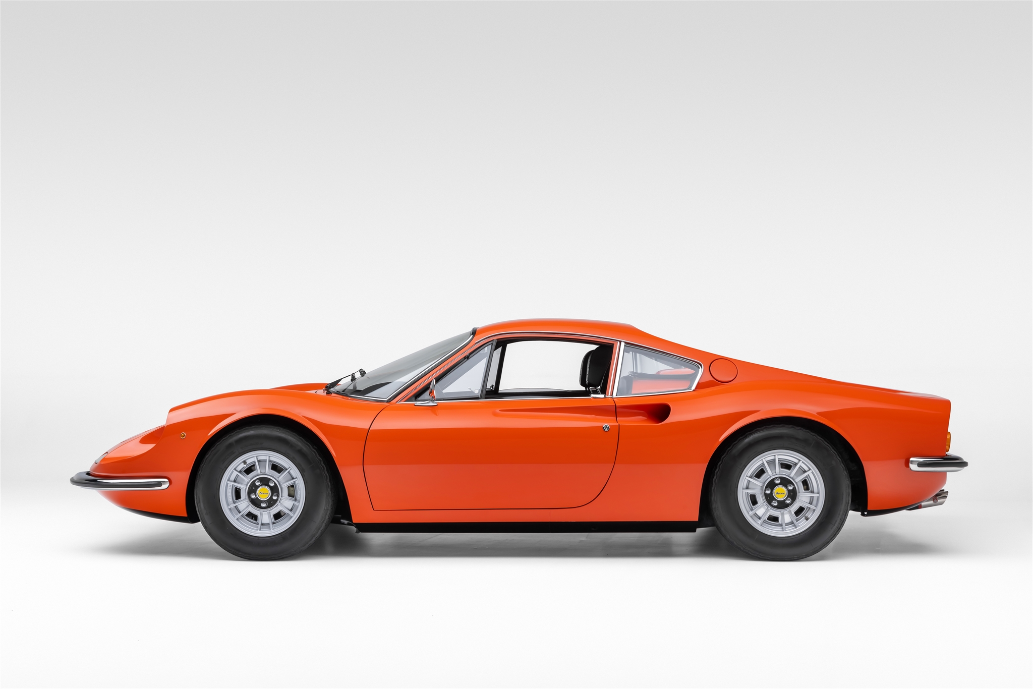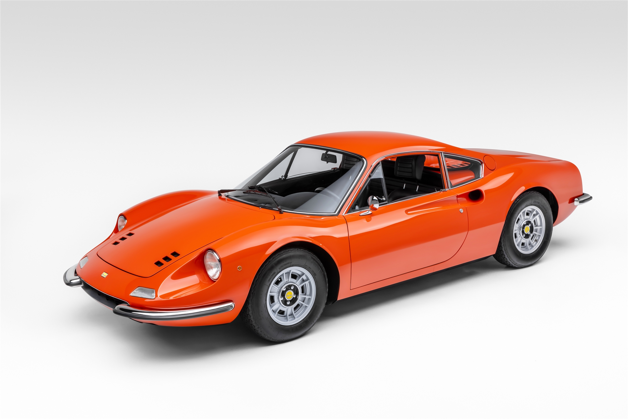 The 14″ Cromodora five-lug alloy wheels wear Dino-branded center caps and are mounted with 205-width Michelin XWX tires. A matching spare wheel is stored in the front trunk. The suspension incorporates unequal-length A-arms, coilover shock absorbers, and anti-roll bars at front and rear. Stopping power is provided by power-assisted ventilated disc brakes all around. The wheels were refinished and the suspension and brakes were rebuilt as part of the refurbishment.