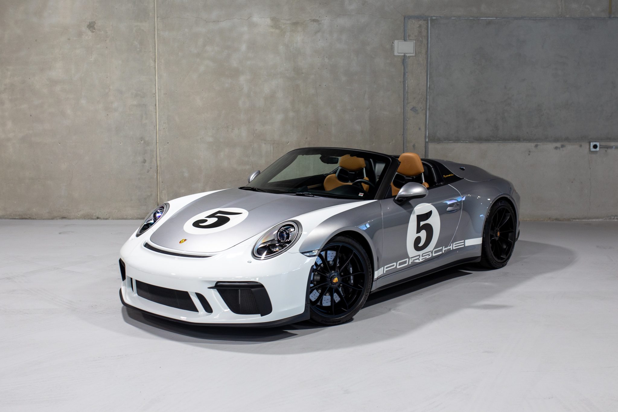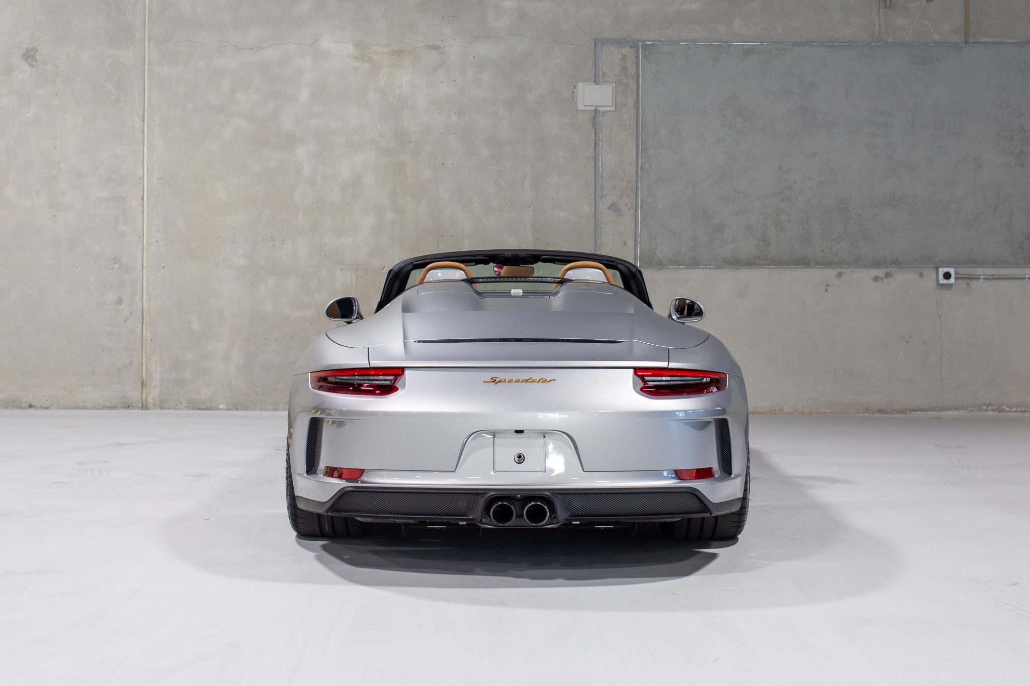 Silver-finished center-locking 20″ forged alloy wheels are mounted with 245/35 front and 305/30 rear Michelin Pilot Sport Cup 2 tires that have 2019 date codes. Braking is handled by four-wheel cross-drilled Porsche Ceramic Composite Brakes with black-finished calipers with white “Porsche” script. Porsche Active Suspension Management (PASM), Porsche Stability Management (PSM), and rear-axle steering were standard on the Speedster, and this example was optioned with a front-axle lift system. A brake fluid flush was performed in March 2024.