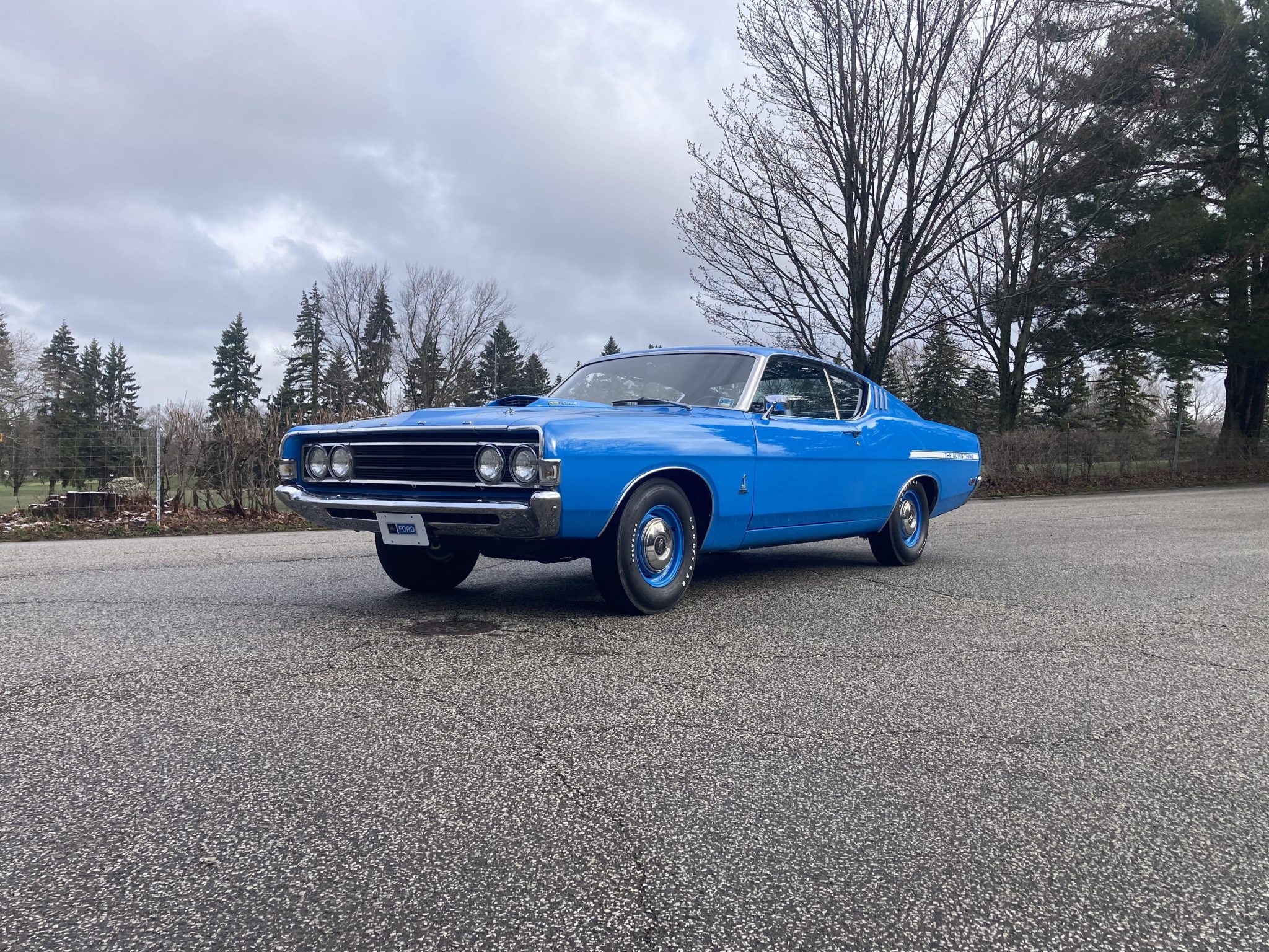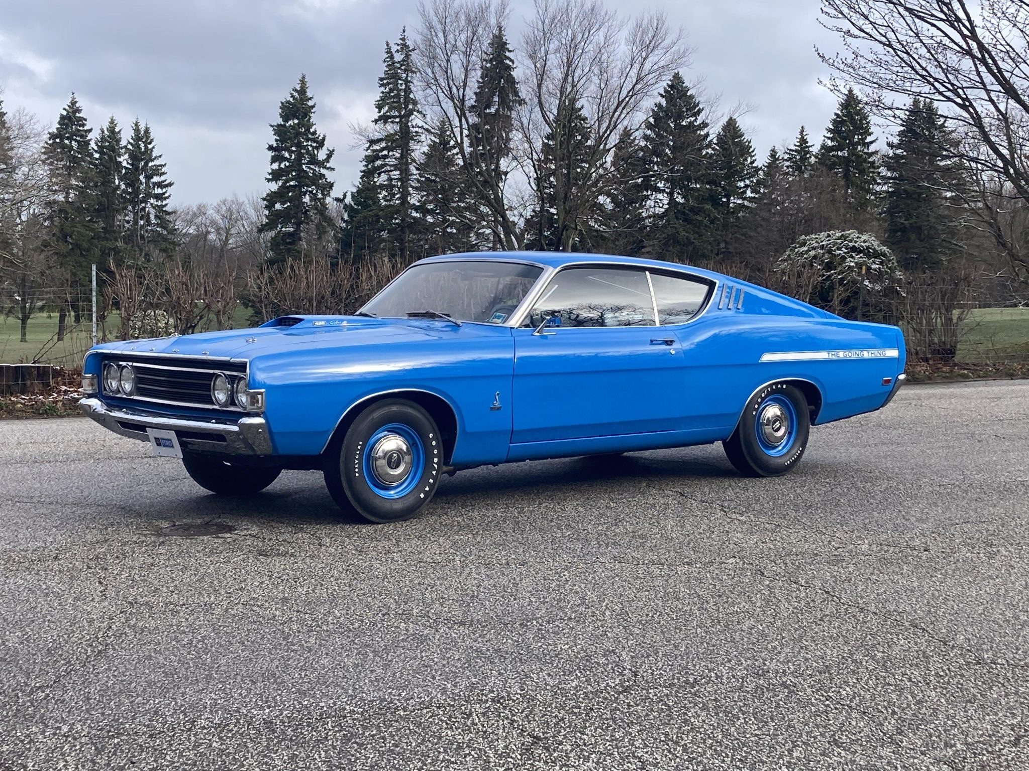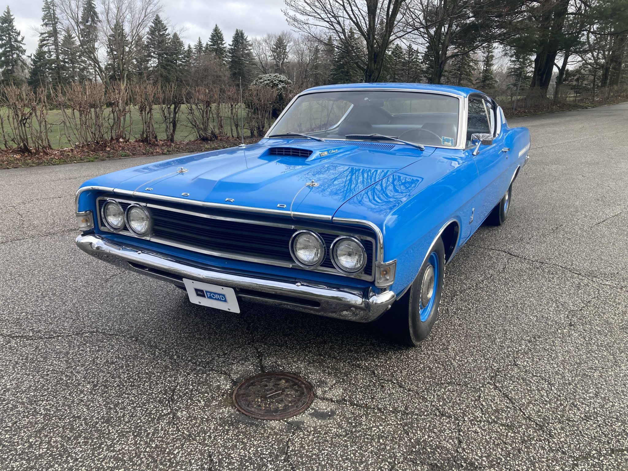 Body-color 14″ steel wheels wear bright hubcaps and are mounted with F70-14 Goodyear Polyglas bias-ply tires. The Cobra hardtop came equipped with a competition suspension package, and this car has optional power steering and power-assisted front disc brakes along with rear drums. Recent service reportedly included replacing the tires and servicing the brakes.