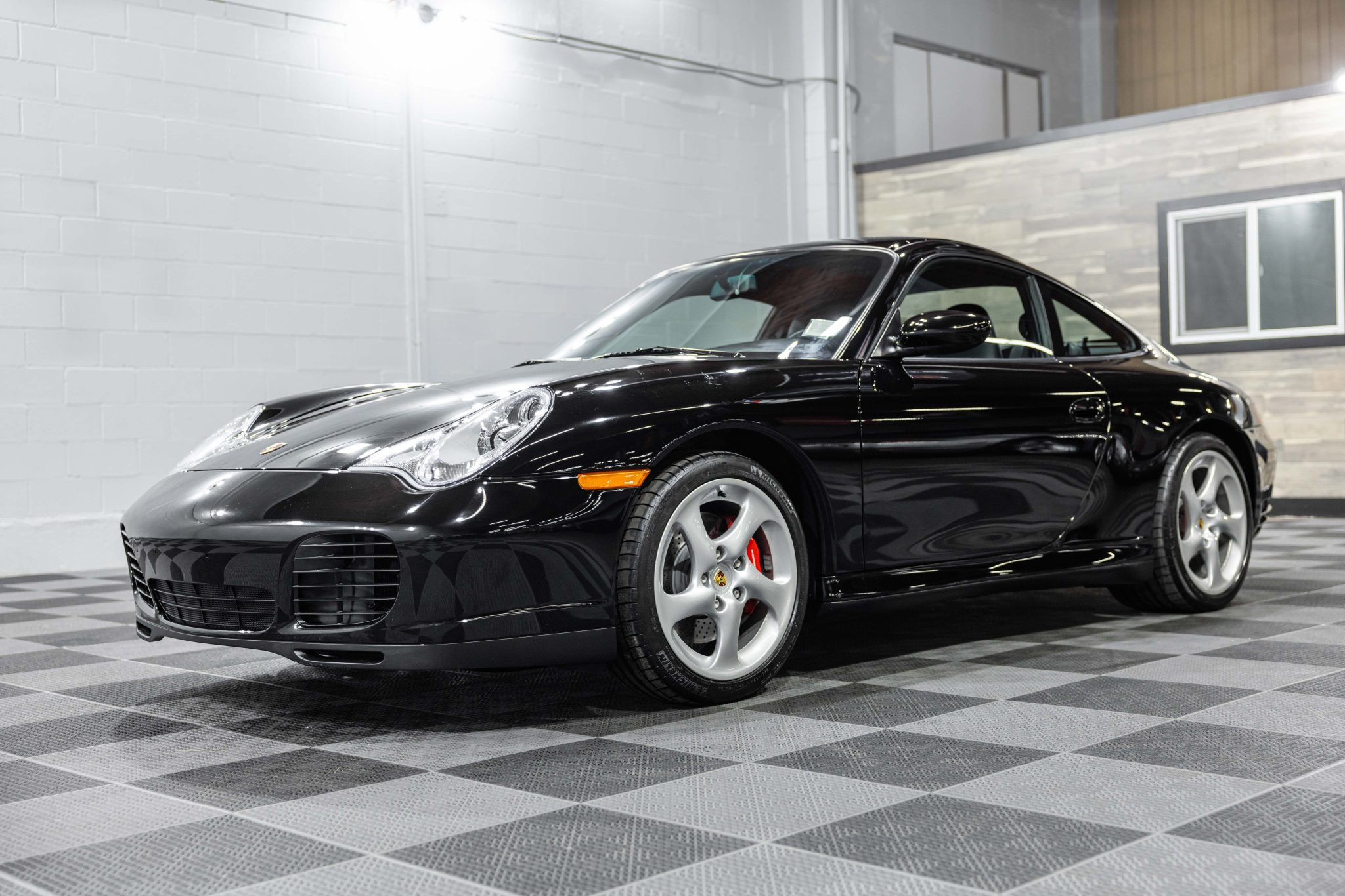 The 18″ Turbo-look wheels are mounted with Michelin Pilot Sport tires. The car is equipped with Porsche Stability Management (PSM) and an Automatic Brake Differential (ABD). Braking is from red calipers over ventilated and cross-drilled rotors at all four corners.