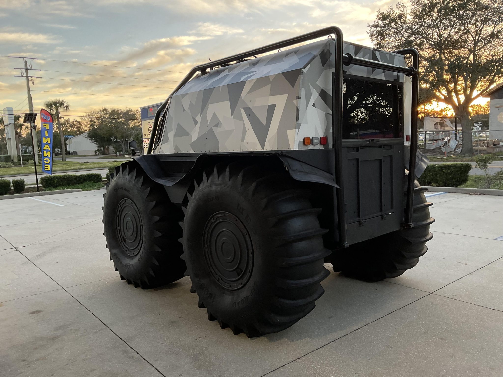 Black-finished 25″ wheels are wrapped in 1600×600-25 WEPN low-pressure tires that feature paddle treads and provide buoyancy and propulsion on water. The setup provides 23″ of ground clearance with the ability to climb or descend a 35-degree grade. Top speed on land is factory rated at 25 mph, while maximum speed on water is 3.7 mph. The vehicle is equipped with a central tire inflation system as well as 15-gallon auxiliary fuel containers located in the center of each wheel. Service in 2023 is said to have involved overhauling the steering assemblies.