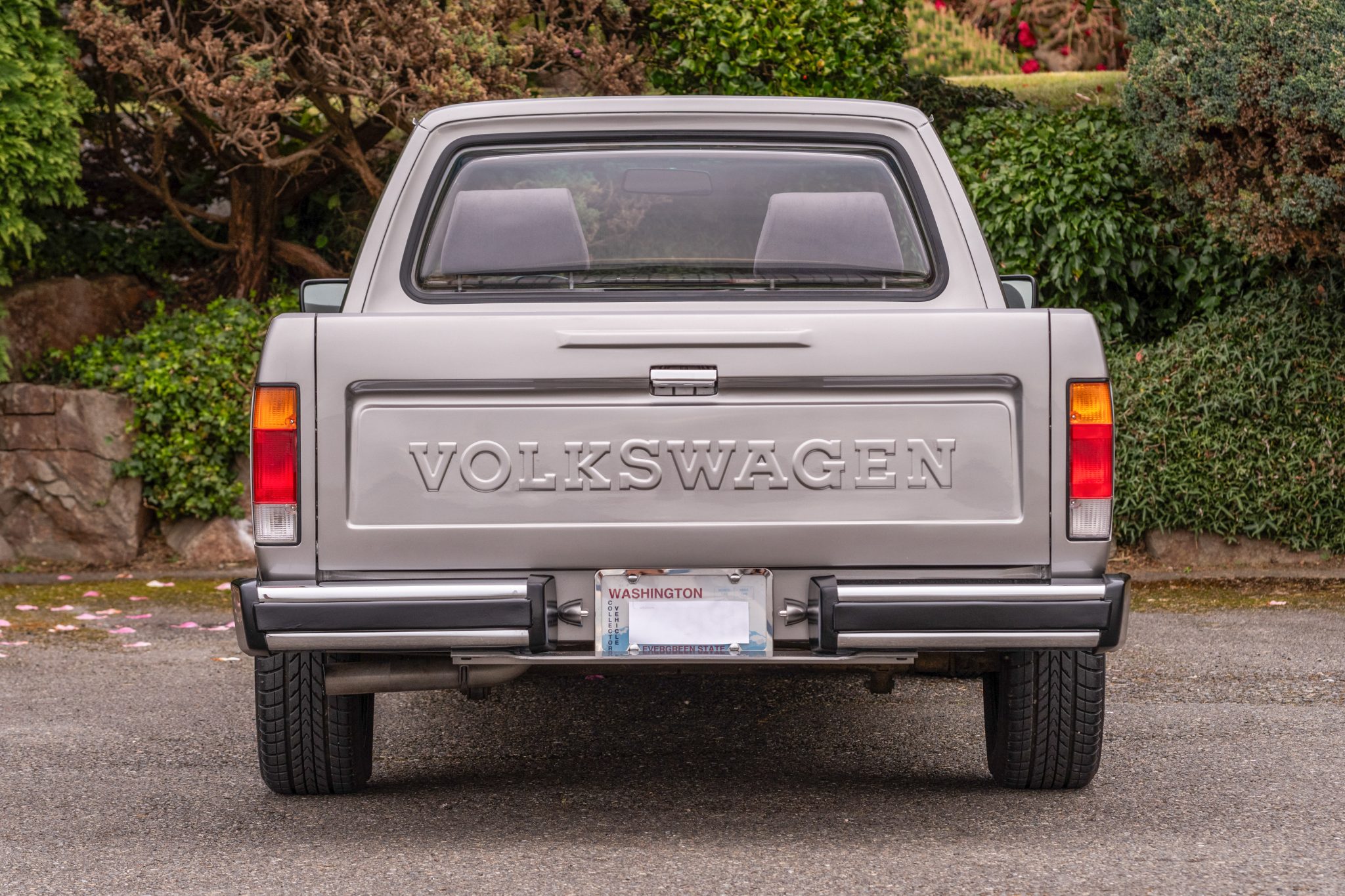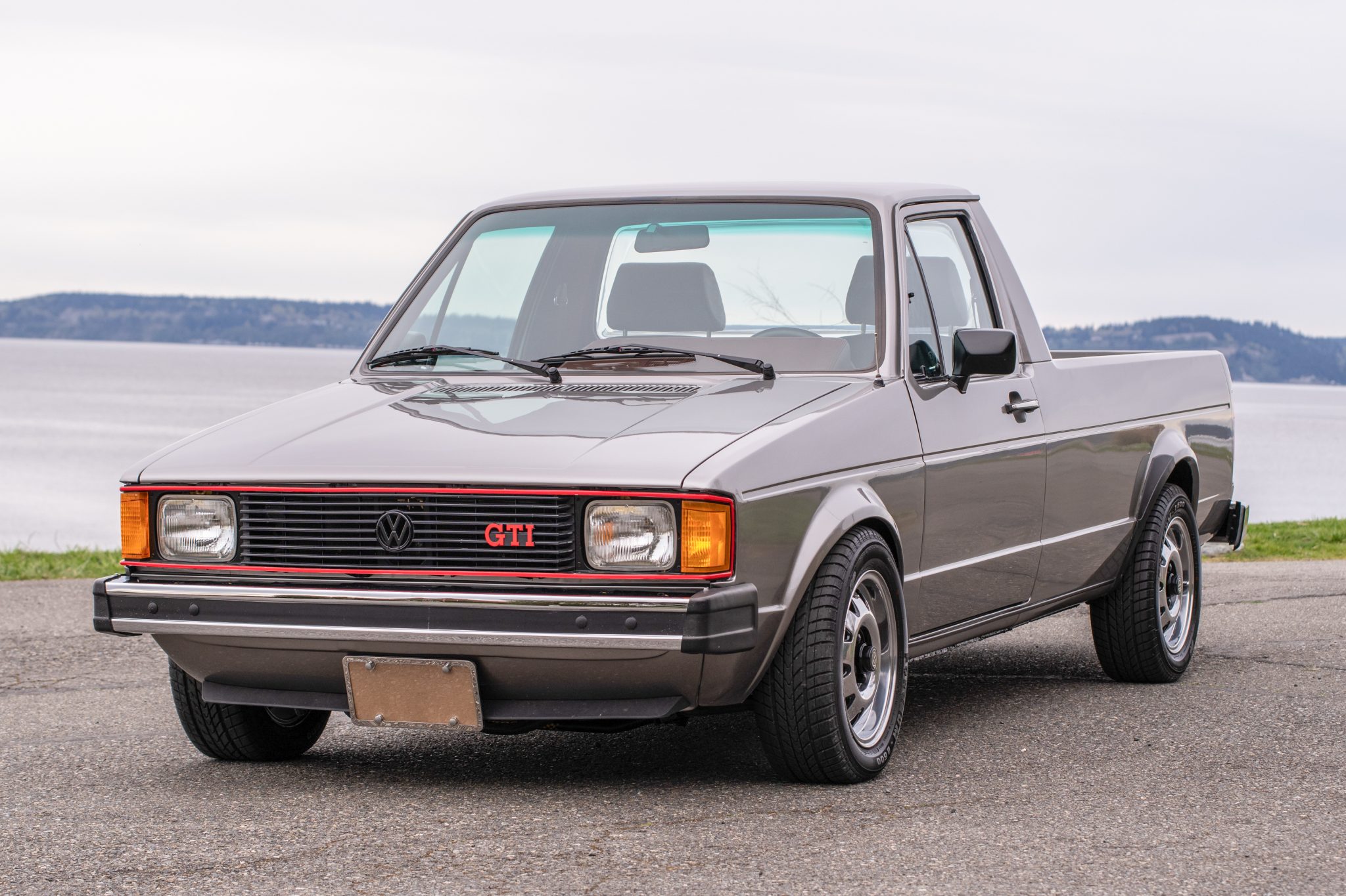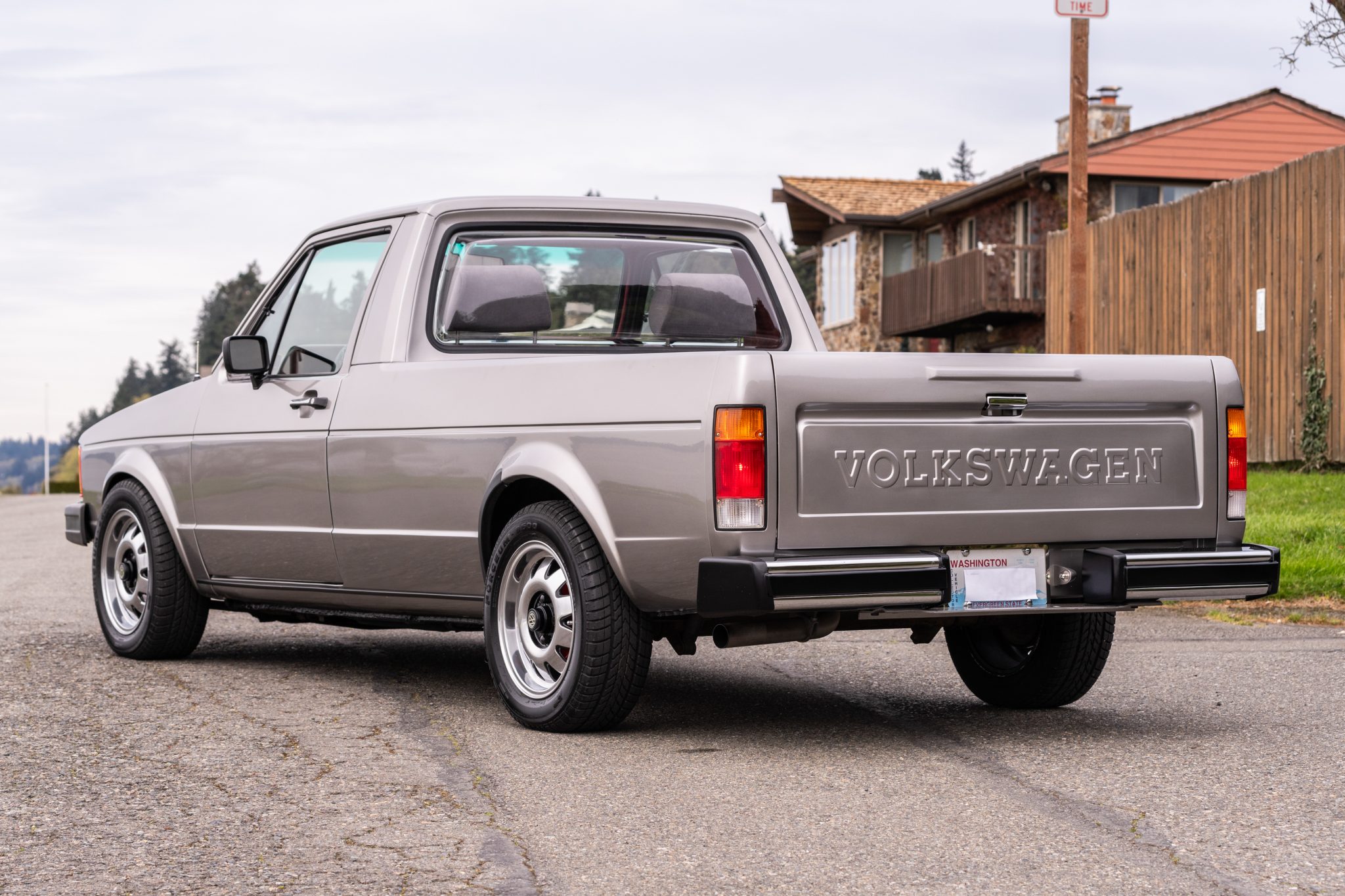 The 14″ wheels are mounted with 195/60 Forceum D600 tires. The suspension has been lowered approximately 1.5″ via the installation of Bilstein front coilovers and modified rear leaf springs. Stopping power is provided by front disc brakes with GTI 16V-specification brake calipers and rotors as well as red-finished rear drums. The truck features a power steering system that was reportedly adapted from 1991 Cabriolet components. The seller notes that a replacement brake master cylinder has been installed along with replacement brake lines, and the front calipers and rear drums were rebuilt under current ownership.