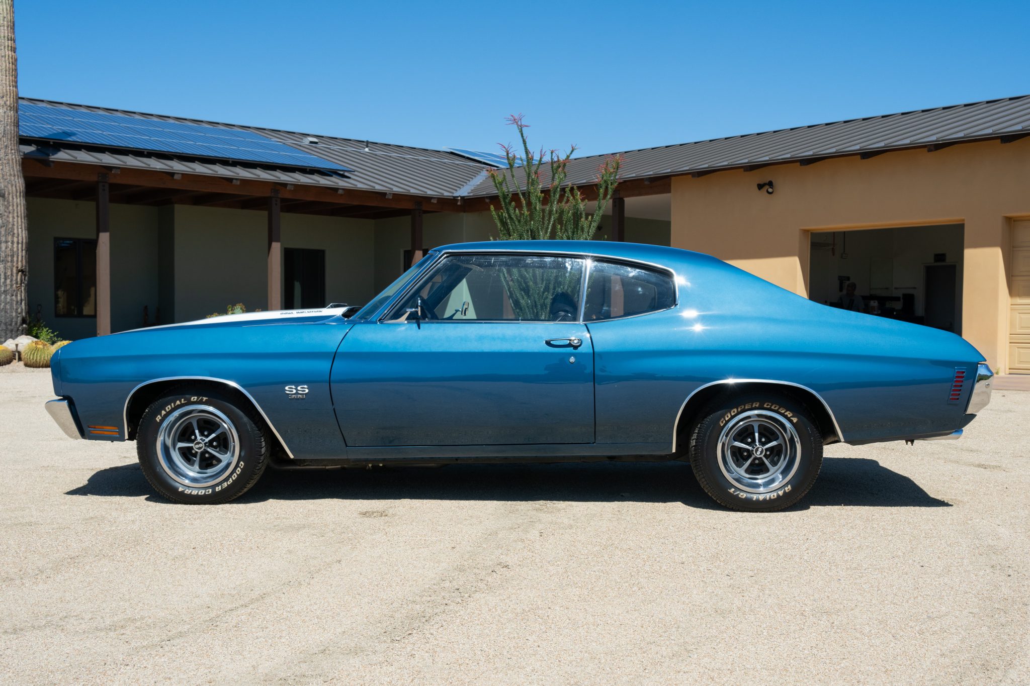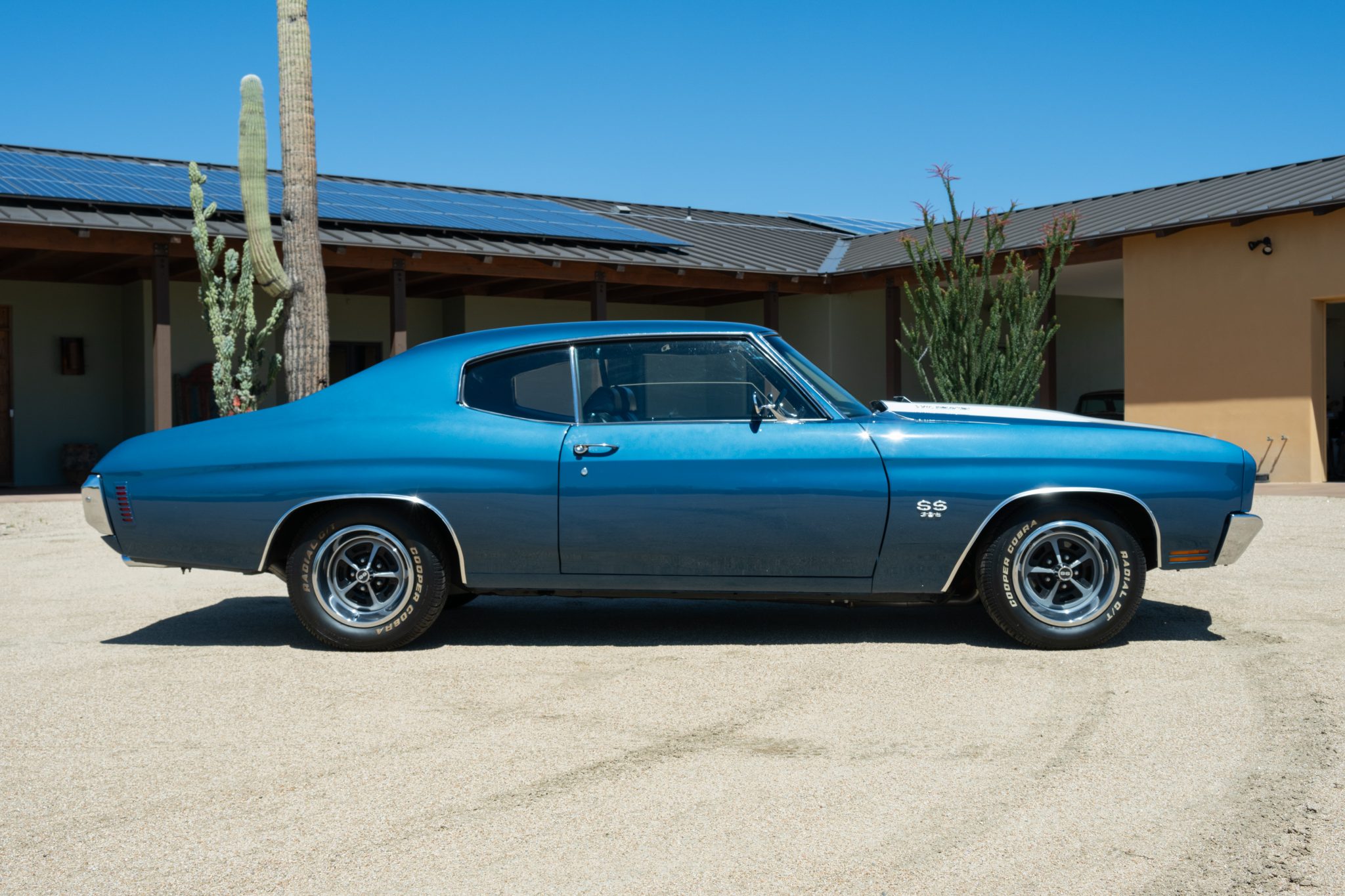 The 15″ Super Sport wheels are mounted with 235/60 front and 245/60 rear Cooper Cobra white-letter tires. The car is equipped with power steering, and braking is handled by power-assisted front discs and rear drums. The seller reports that Hotchkis rear suspension components have been installed.