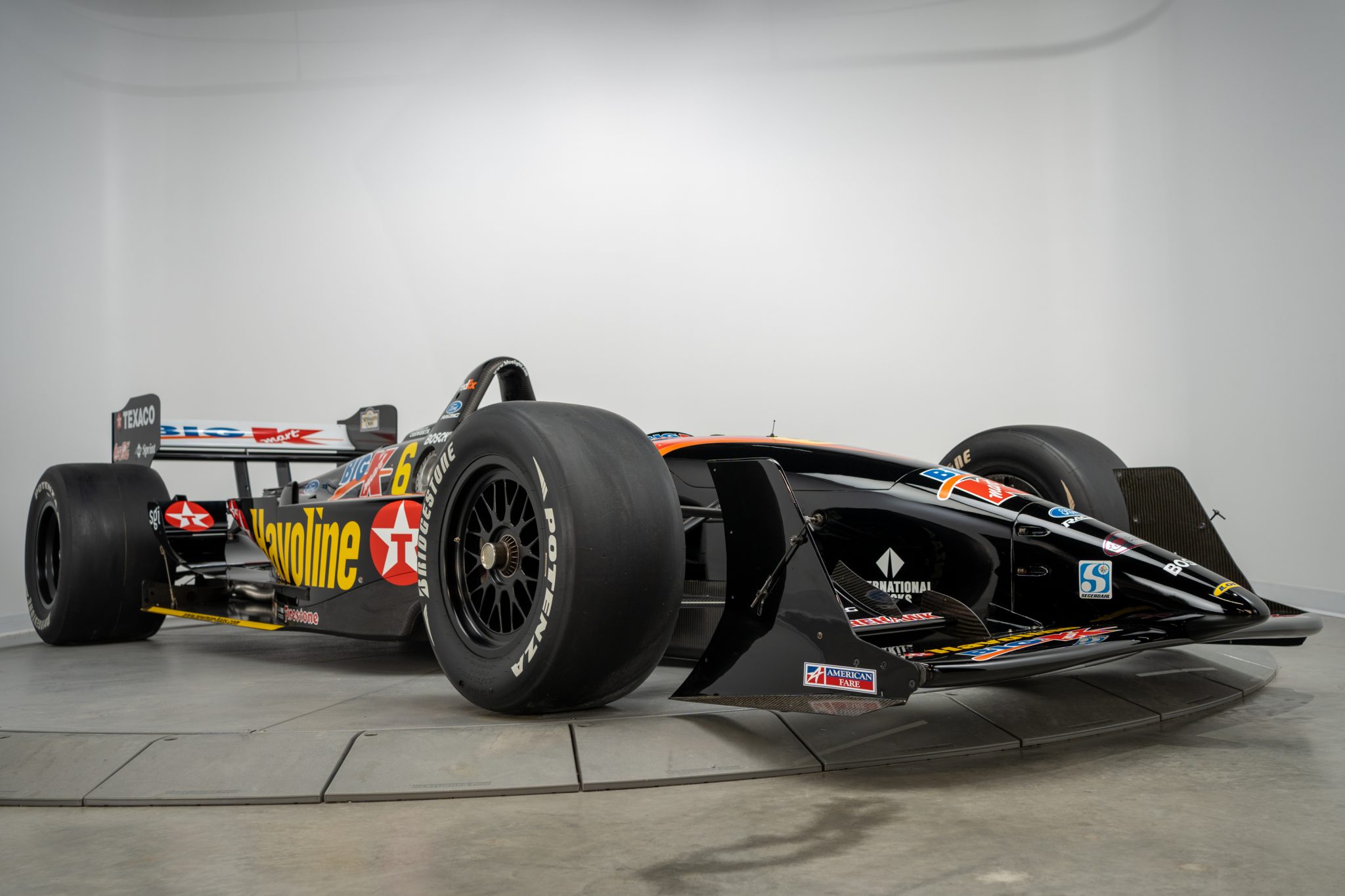 The carbon-fiber body panels are finished in a black, red, and orange No. 6 livery with sponsors including Havoline, Texaco, and Big K. Features include multi-element front and rear wings, exposed carbon-fiber sidepod flicks, dual side mirrors, and a roll hoop.