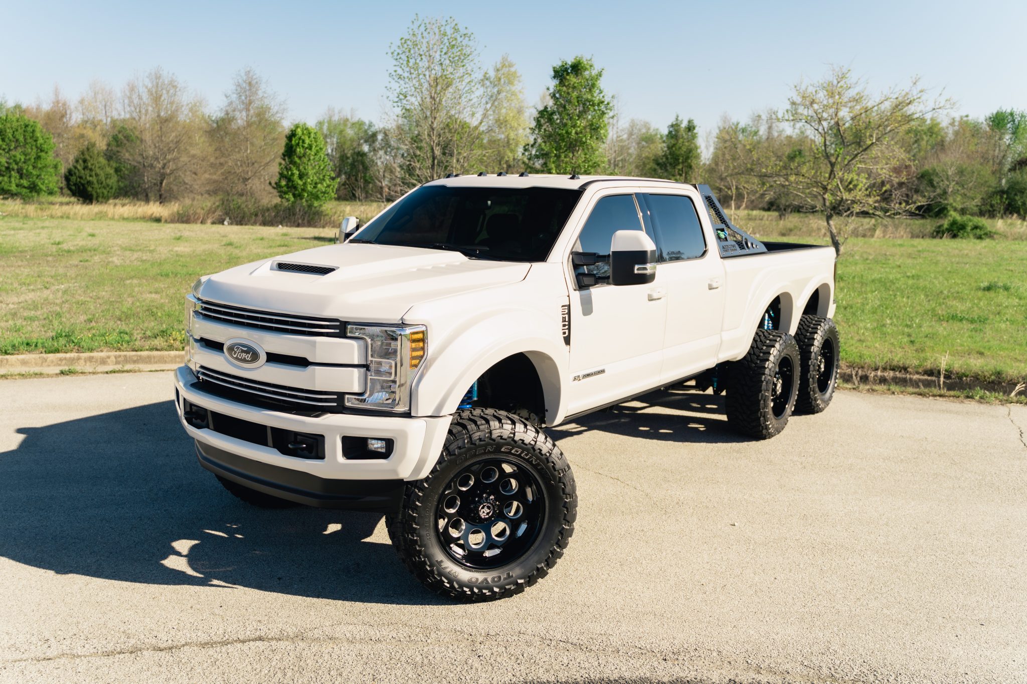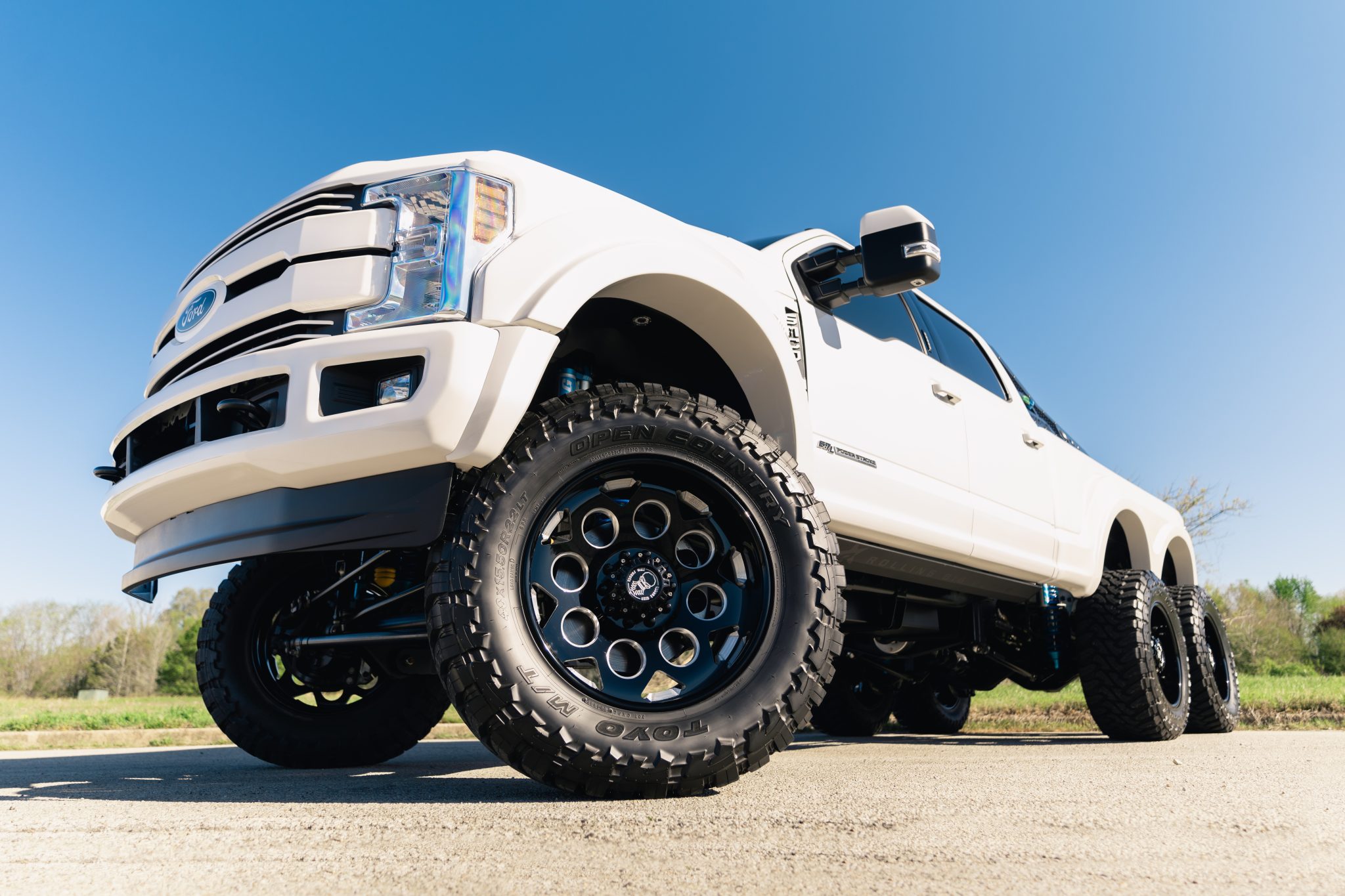 Black-finished 22″ Grid Off-Road forged wheels are mounted with 40×15.5″ Toyo Open Country M/T tires. The rig rides on an 8″ lifted suspension with King remote-reservoir shock absorbers as well as Firestone rear air springs.