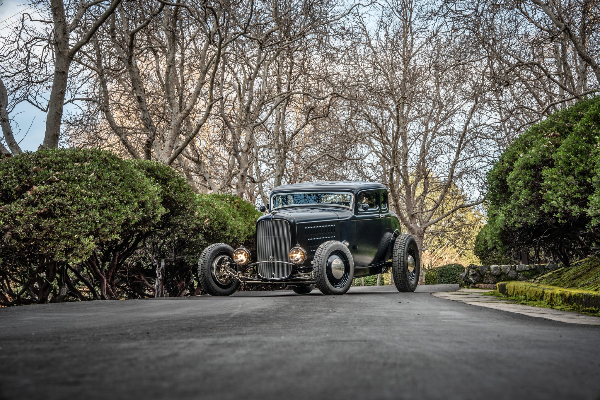 The rails for the custom frame were fabricated in New York, and suspension utilizes torsion bars all around in addition to a drilled front axle, drilled front wishbones, and rear ladder bars. Lever-actuated and adjustable front tube shocks are mounted behind the radiator, and nickel-finished suspension and steering components complement the grille, headlight bar, and tilt-out windshield frame. Other details include a hooded-skull radiator ornament, a vertical-bar rear license plate bracket, Guide headlight housings, and dual exhaust outlets.