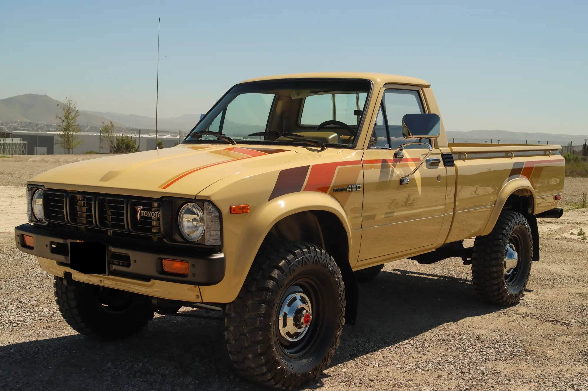 Black-finished 15″ factory Toyota steel wheels wear 31×10.5″ Rolling Big Power Repulsor M/T tires that were reportedly mounted in 2024, and a spare is secured to an under-chassis carrier. The truck is equipped with manually locking front hubs, and braking is handled by front discs and rear drums.