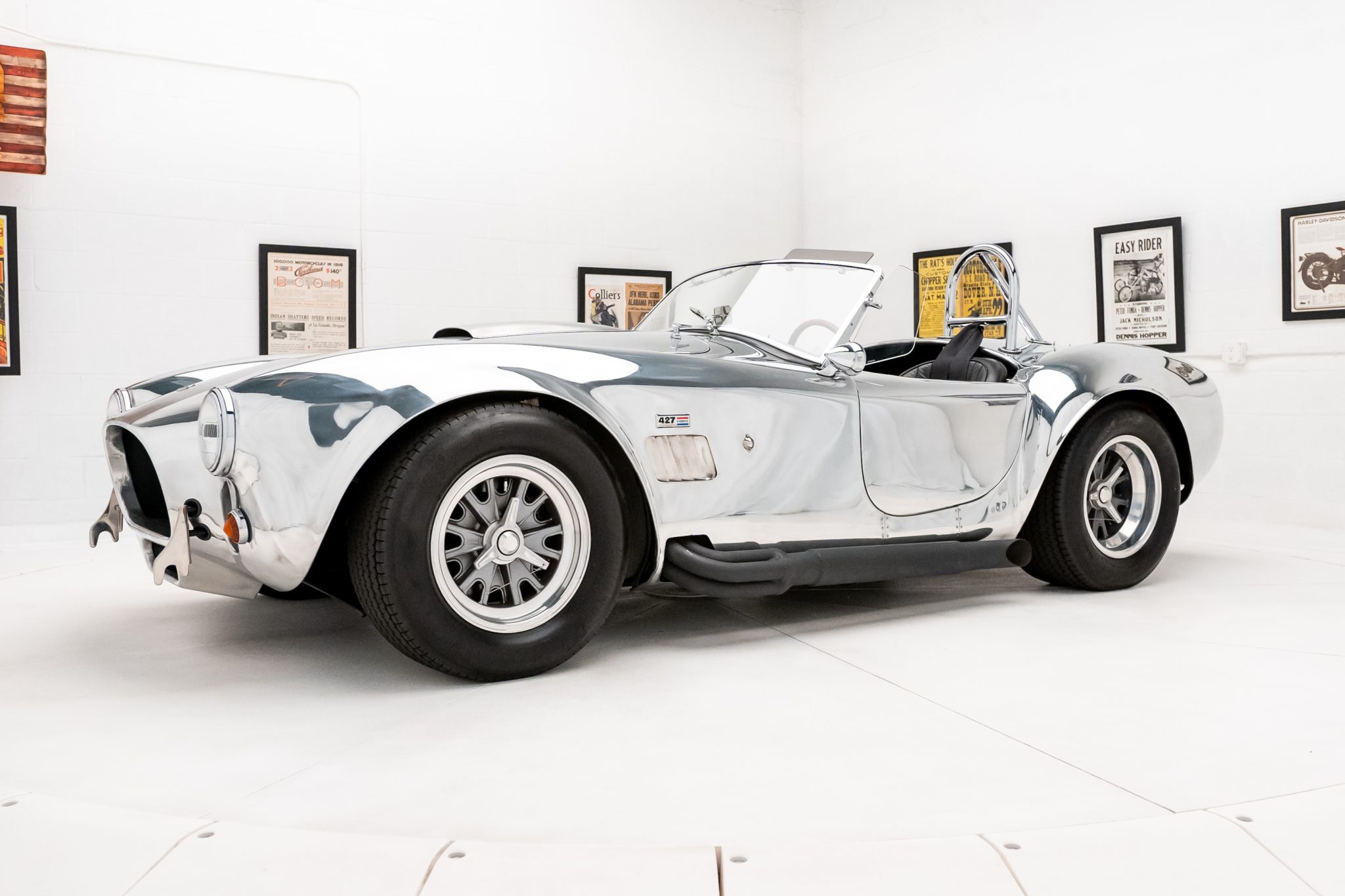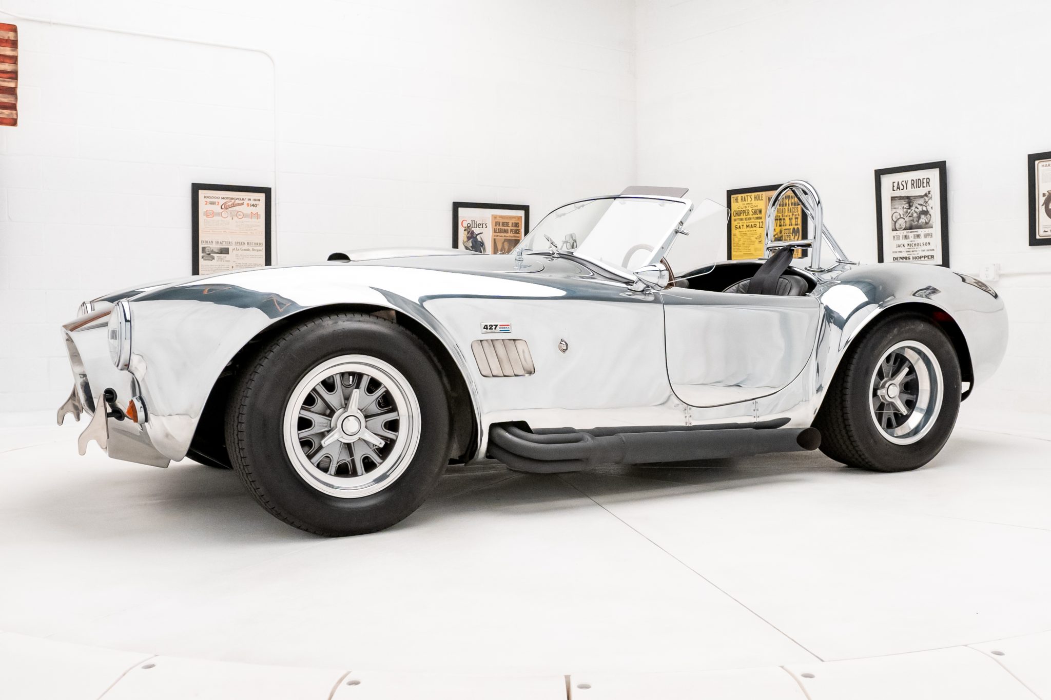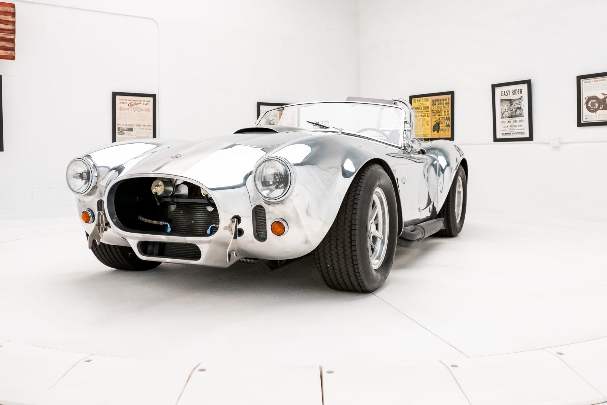Halibrand-style 15” wheels are secured with safety-wired knock-off spinners and wrapped in Goodyear Eagle Sport Car Special tires measuring 26×8″ up front and 26×10.5″ out back. The car is equipped with rack-and-pinion steering and a four-wheel independent suspension with adjustable coilovers. Braking is handled by unassisted Wilwood discs at all four corners.