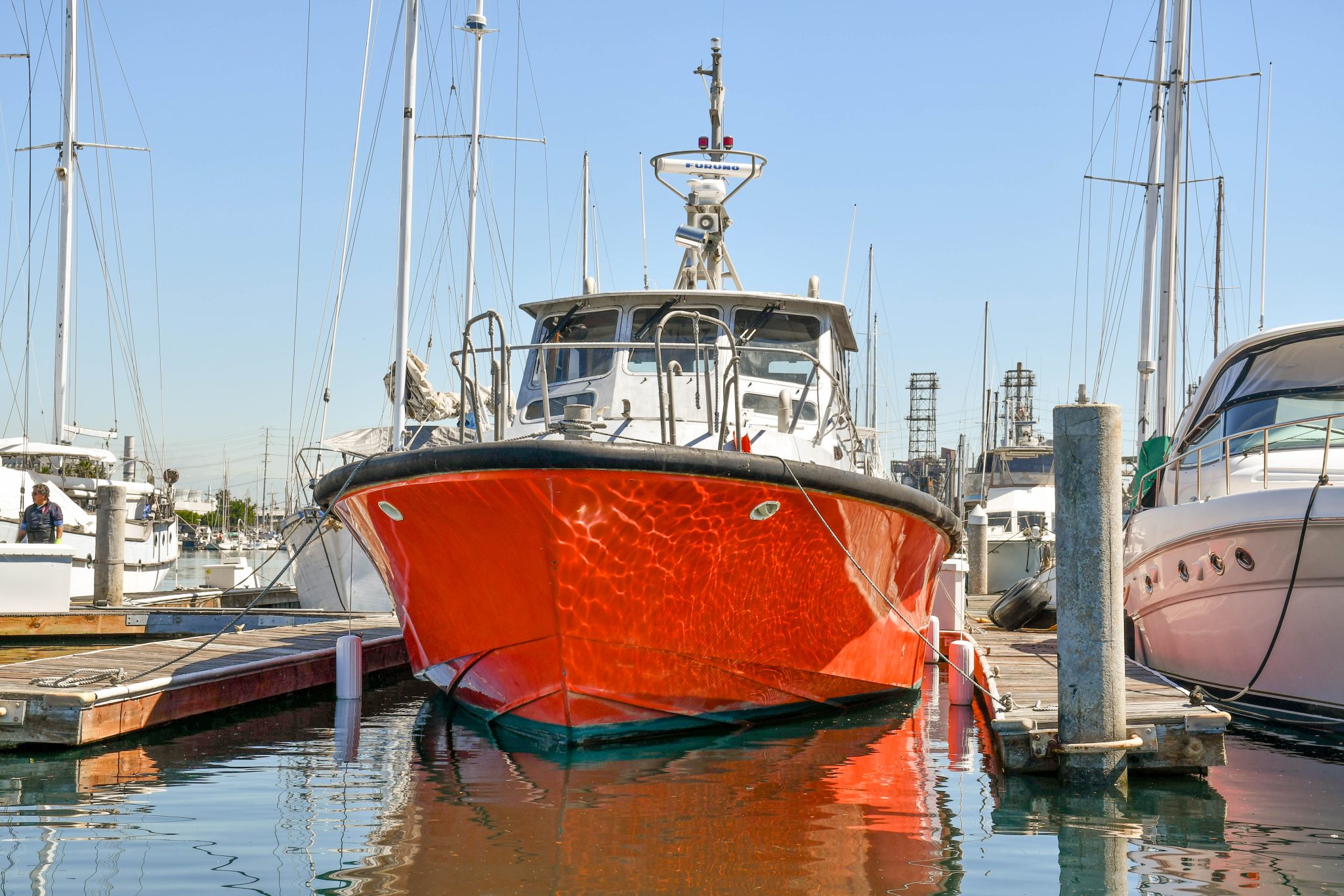 A hatch on the foredeck provides access to a compartment containing a 45-pound Danforth-style anchor with chain and line rode. Cleats, handrails, and ventilation pipes are welded to the deck which is surfaced with black non-skid pads over unpainted aluminum.