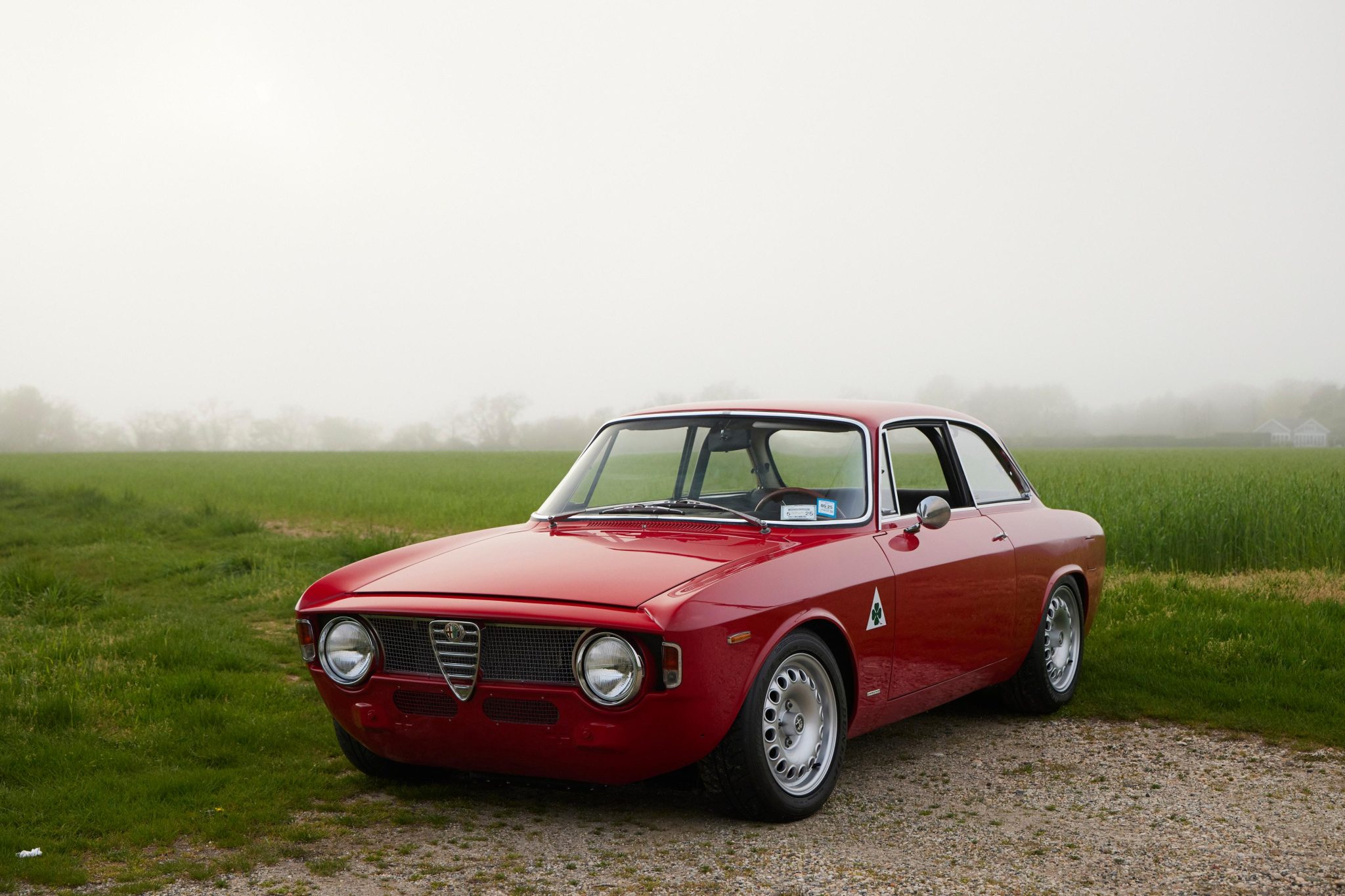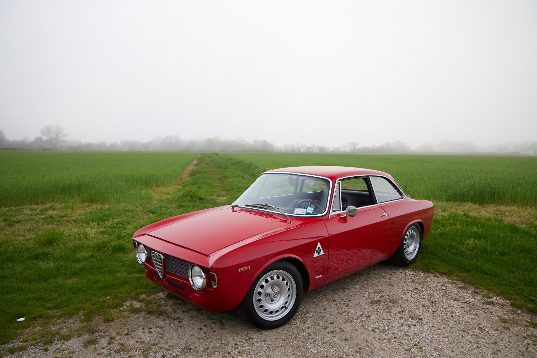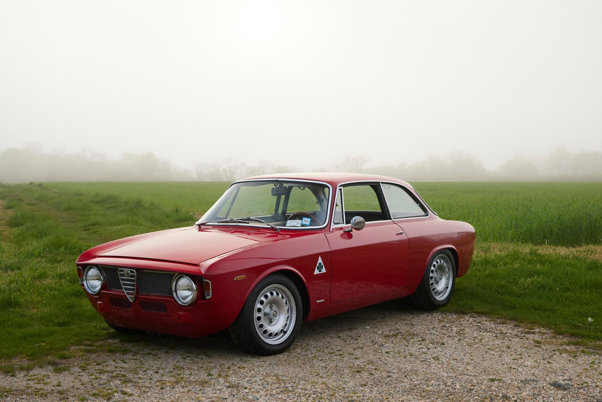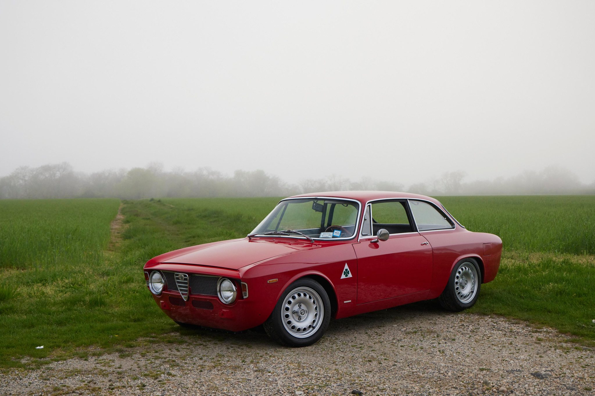 15″ Alfaholics GTA-style wheels are mounted with 195/55 Dunlop Direzza tires. The car is equipped with four-wheel disc brakes and has been fitted with front lowering springs, lightweight front spring pans, an upgraded front sway bar, cut rear springs, rear shock turret extenders, lightweight rear trailing arms, and heavy-duty trailing arm bushings.