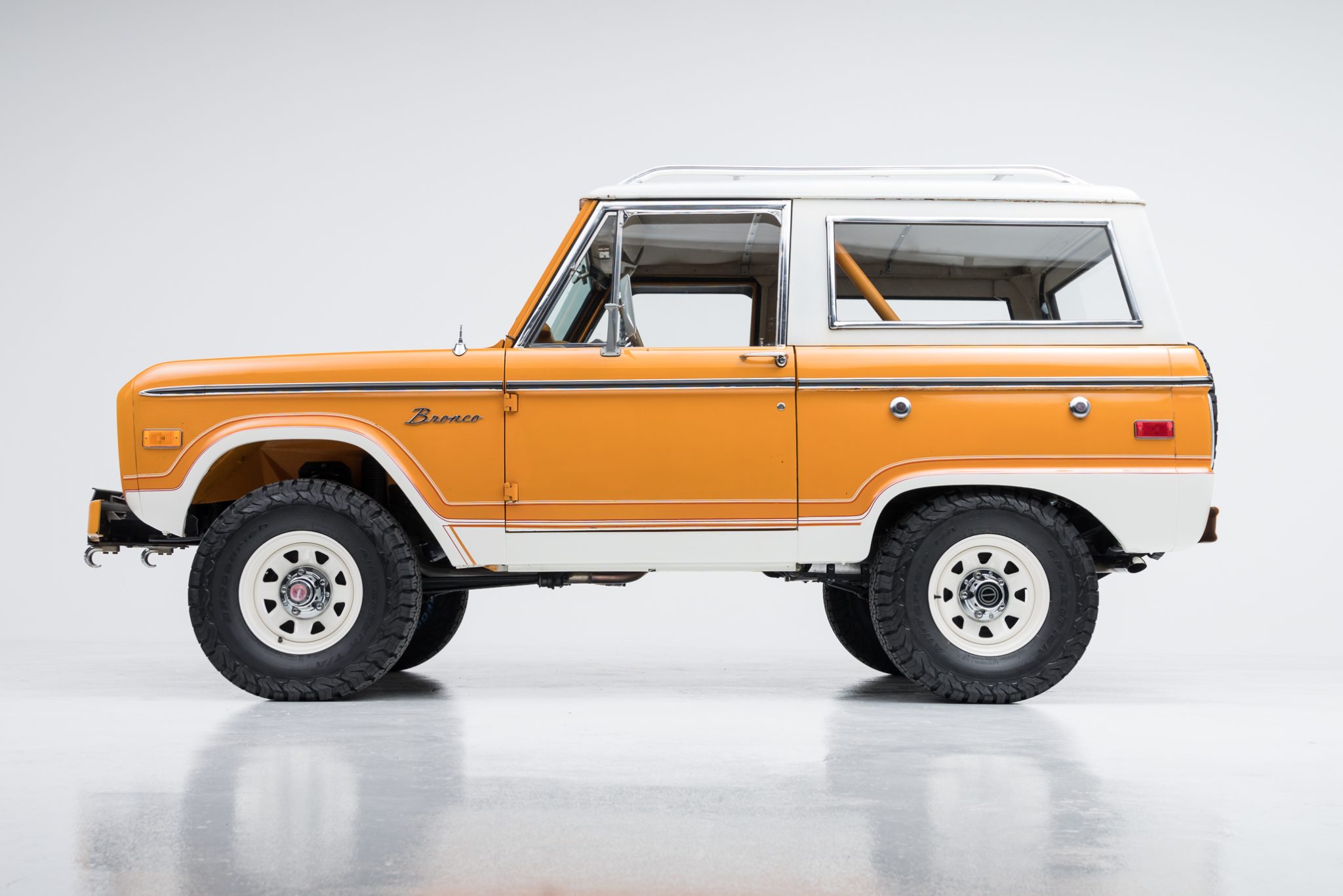 The white-finished 15″ steel wheels are mounted with 31×10.5″ BFGoodrich All-Terrain T/A K02 tires that were installed recently. Work under current ownership is said to consist of fitting a suspension lift, Bilstein shock absorbers, and a power brake booster, machining the rear drums, and replacing the wheel cylinders and brake shoes. The truck is equipped with manually locking hubs and power-assisted steering.