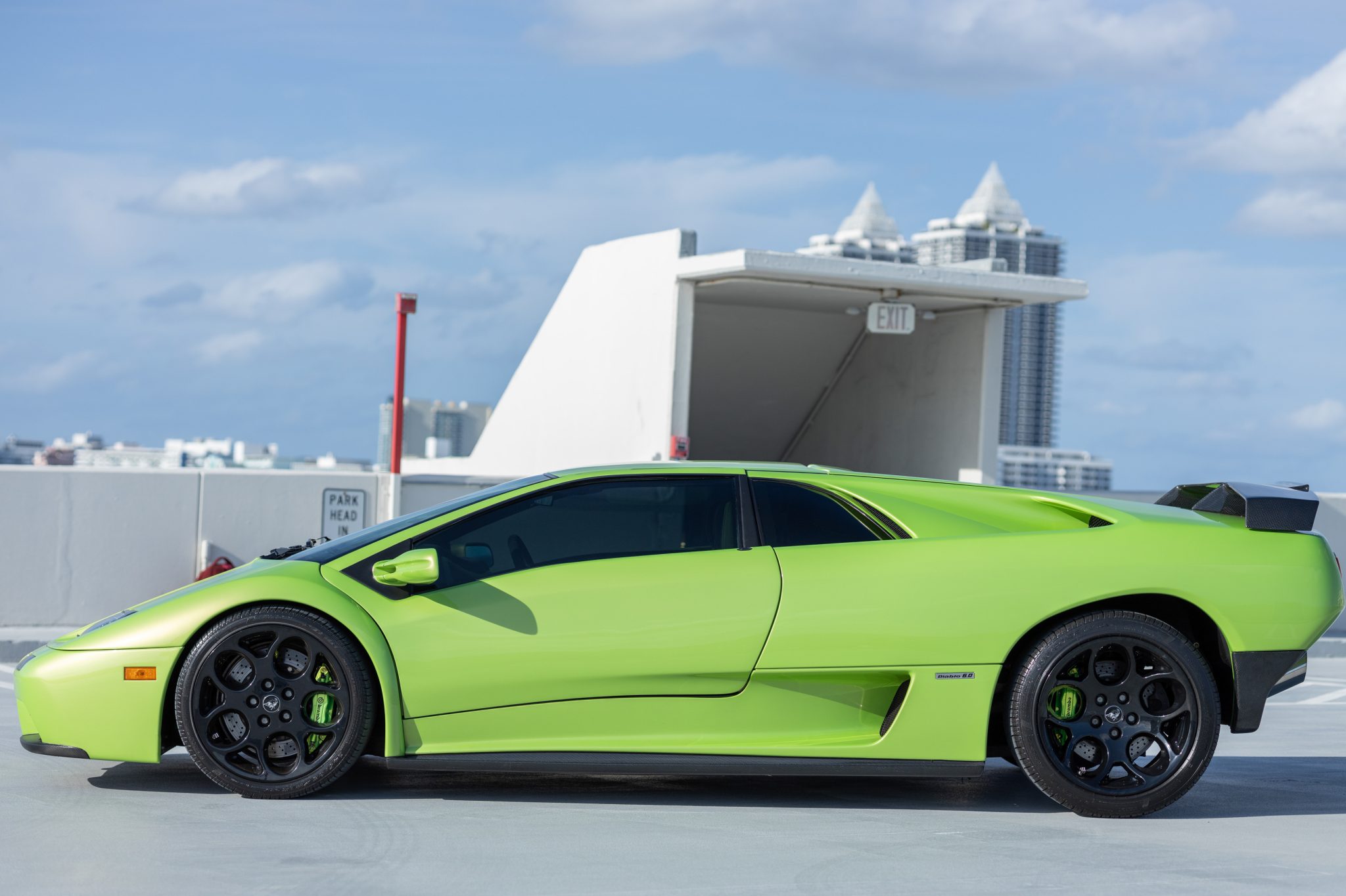 This example was finished from the factory in yellow but has been repainted in Verde Ithaca, and additional features include scissor doors and fixed composite headlights sourced from the contemporary Z32 Nissan 300ZX. Clear paint-protection film covers the bodywork, and the removed bumper cover is shown in the gallery below. Carbon-fiber covers have been fitted over the fog lamps.