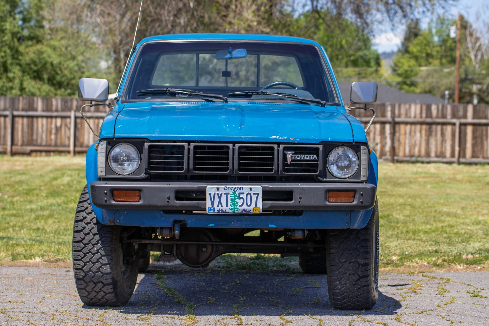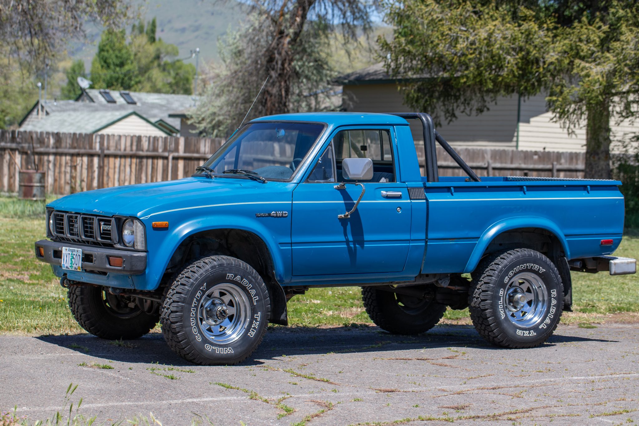 Chrome-finished 15″ wheels are mounted with 31×10.50″ Wild Country Radial TXR tires. A full-size spare is secured below the cargo bed. The truck is equipped with manually-locking front hubs, and stopping power is provided by front disc and rear drum brakes.