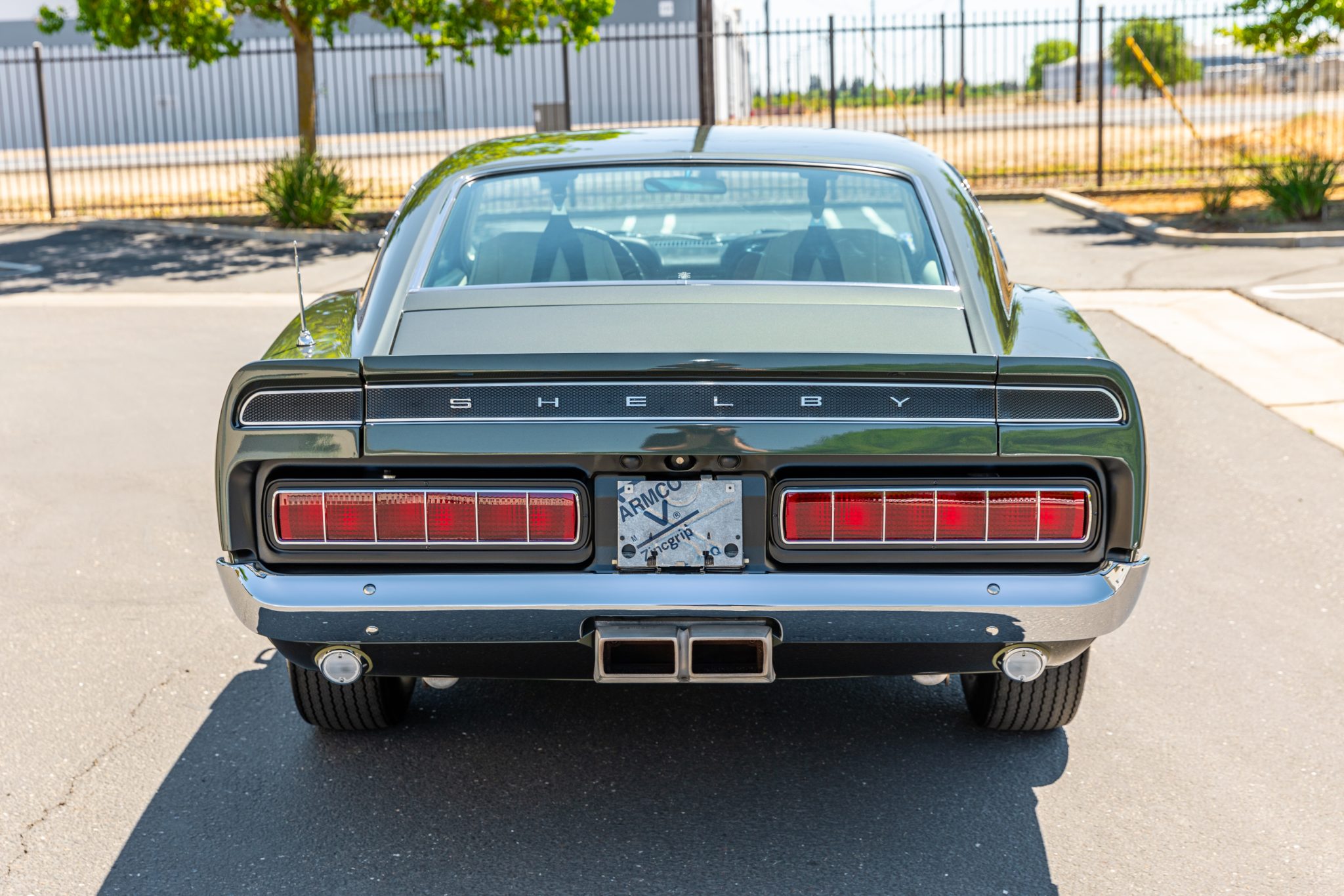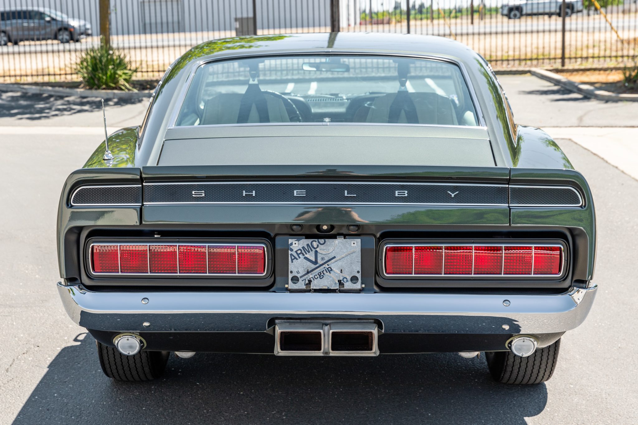 Five-spoke 15″ wheels wear black Shelby center caps and are wrapped in Goodyear Polyglas GT F60-15″ tires with raised white lettering. A space-saver spare is stowed in the trunk along with a jack. The car is equipped with power steering, and braking is provided by power-assisted discs up front and drums out back.