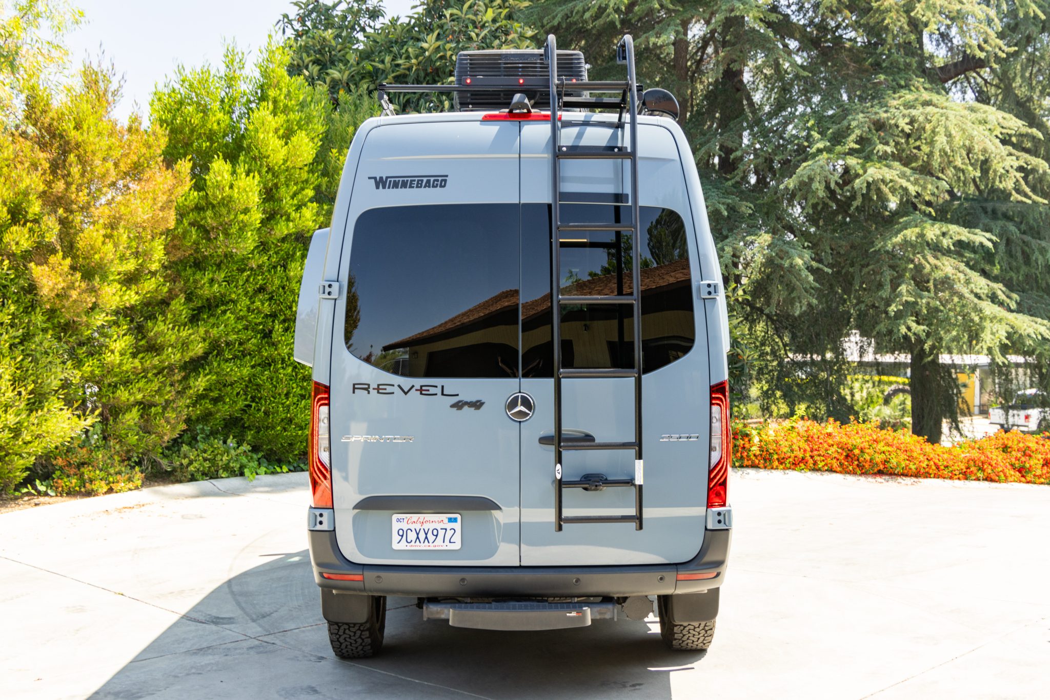 Method Race 17″ alloy wheels are mounted with 245/70 BFGoodrich All-Terrain T/A Tires, and a spare is secured to the underside. Stopping power is provided by four-wheel disc brakes. The motorhome measures approximately 19.5′ long, 10′ high, and 7’1″ wide.