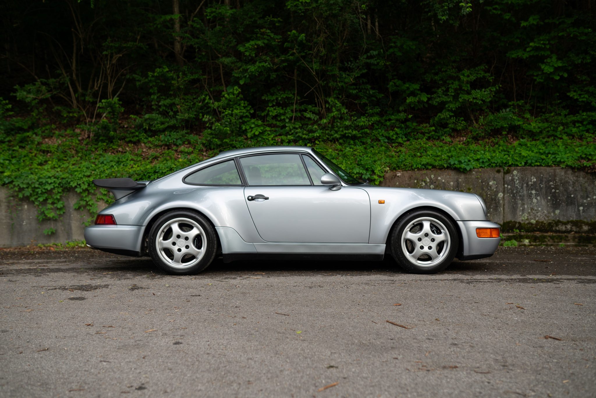 The 17″ Cup wheels are mounted with Continental Extreme Contact tires. The Turbo features uprated brakes compared to the standard 964, including larger calipers and cross-drilled rotors at each corner. The car is equipped with adjustable Bilstein coilovers.
