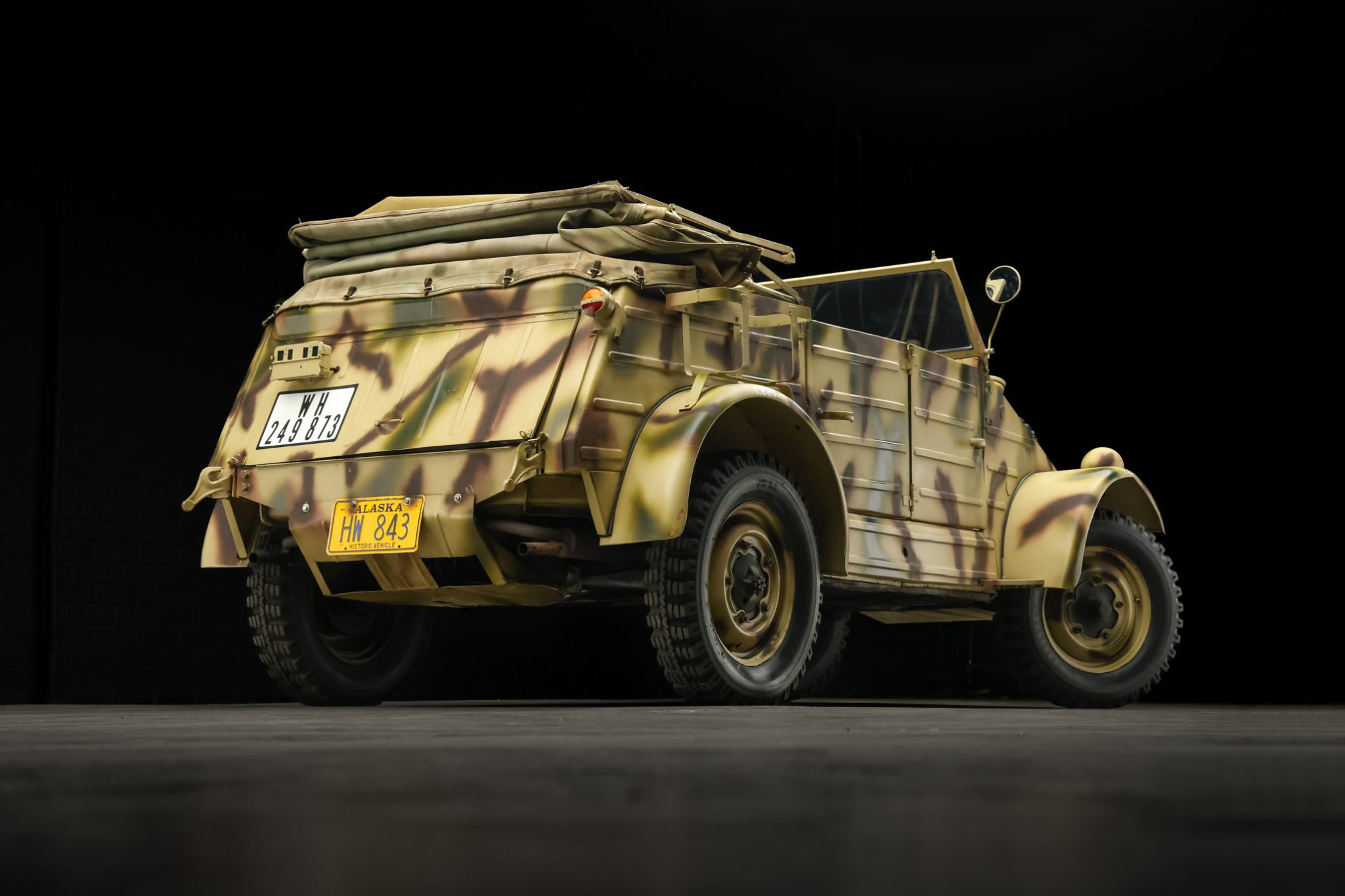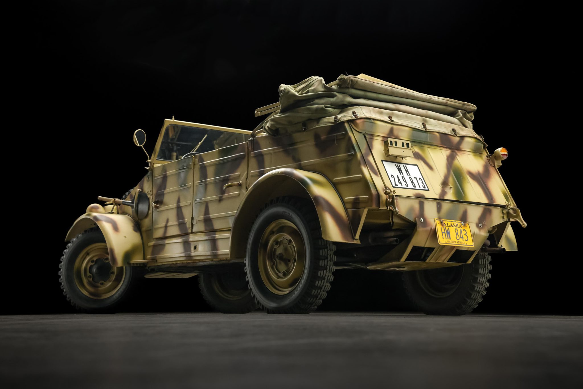 The 16″ steel wheels are painted beige with camouflage markings and mounted with 6.00-16 Fulda Transport M tires, as is a nose-mounted spare. Stopping power is provided by cable-operated drum brakes. The independent torsion-bar suspension utilizes single-acting tubular shock absorbers up front and double-acting lever-arm shocks at the rear.