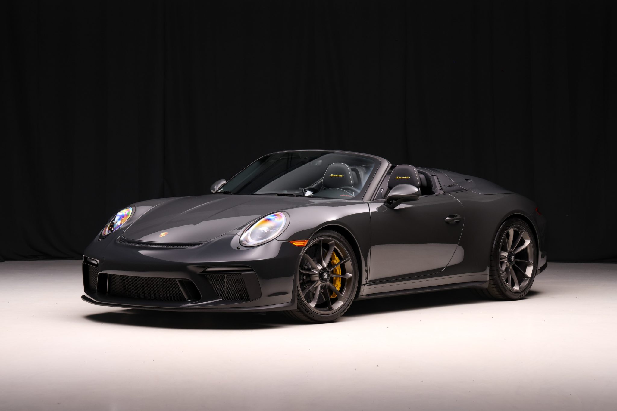 Satin Platinum-finished center-locking 20″ forged alloy wheels are mounted with staggered-width Michelin Pilot Sport Cup 2 tires showing 2022 date codes. Braking is handled by four-wheel cross-drilled Porsche Ceramic Composite Brakes with yellow Porsche-branded calipers. Porsche Active Suspension Management (PASM), Porsche Stability Management (PSM), and rear-axle steering were standard on the Speedster, and this example was optioned with a front-axle lift system.