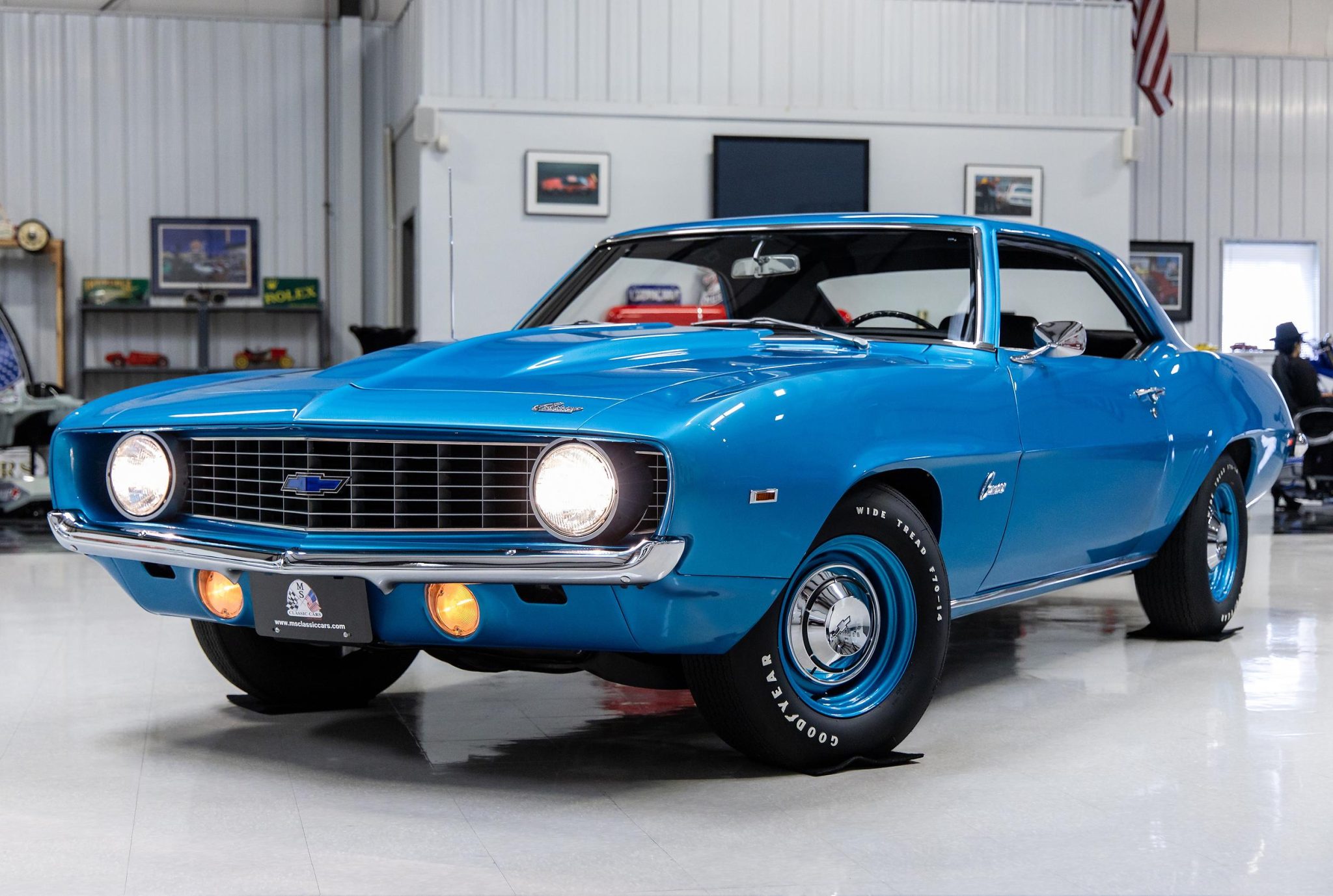 The coupe features a ZL2 cowl-induction hood and was refinished in LeMans Blue (71) during the aforementioned refurbishment, a process that involved replicating assembly markings and overspray on the inner panels, firewall, and subframe. Additional details include chrome bumpers, bright rocker-panel trim, and a driver-side mirror.