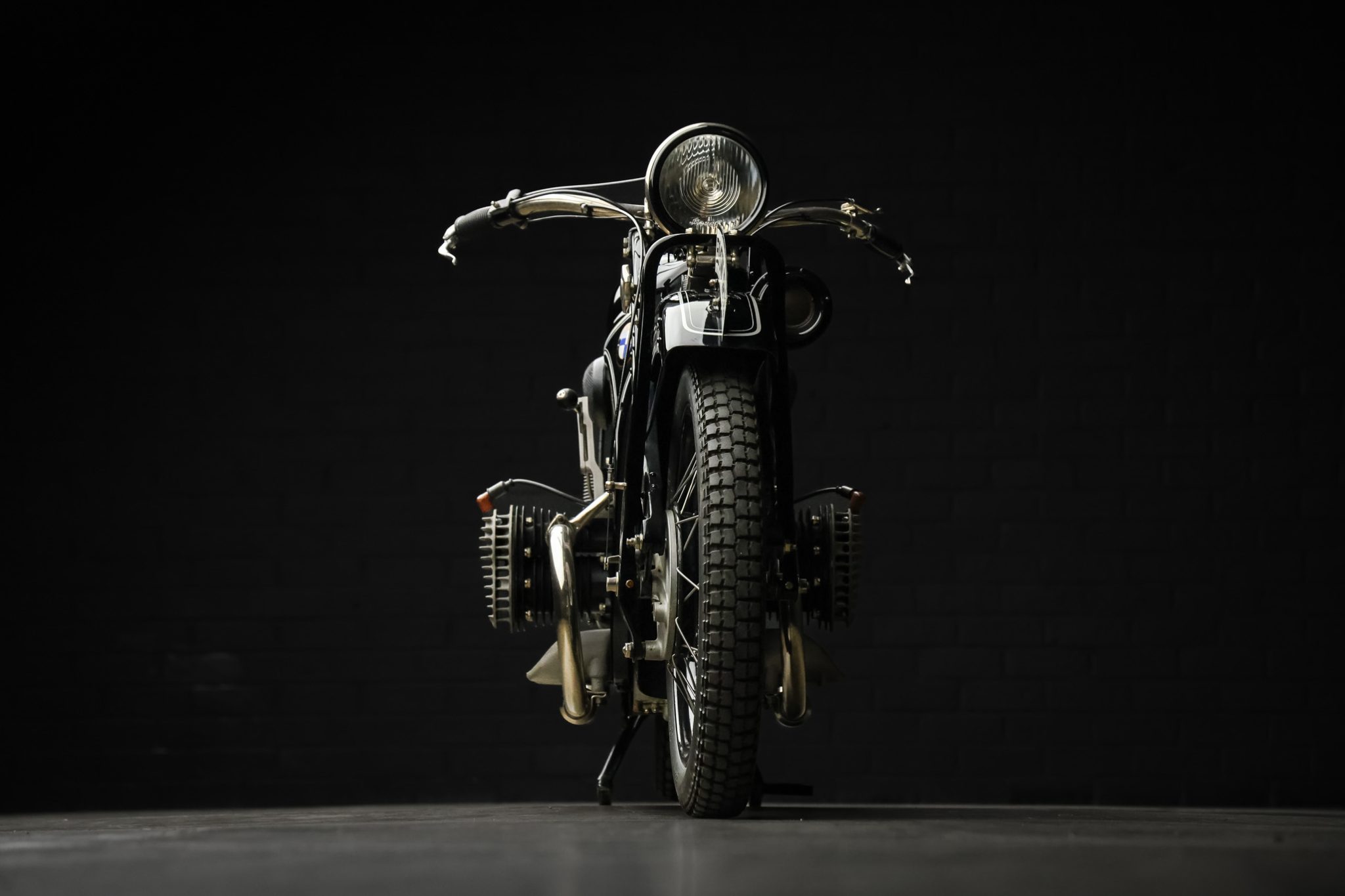 Wire-spoke 19″ wheels with black-finished rims are mounted with Barum Polar front and Firestone Phoenix rear tires. Braking is provided by a 200mm single leading-shoe front drum and a right-heel-actuated 55mm contracting band acting on the driveshaft. The bike’s sole suspension consists of a leaf-spring trailing-link fork.