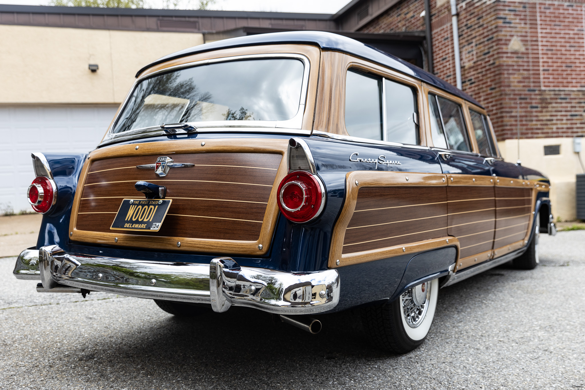 Chrome 15″ wire wheels wearing Ford-crest hubcaps are mounted with with 205/75 Coker Classic whitewall tires, and a spare is stowed beneath the rear cargo deck. The steering is power-assisted as are the brakes, which consist of front discs and rear drums.