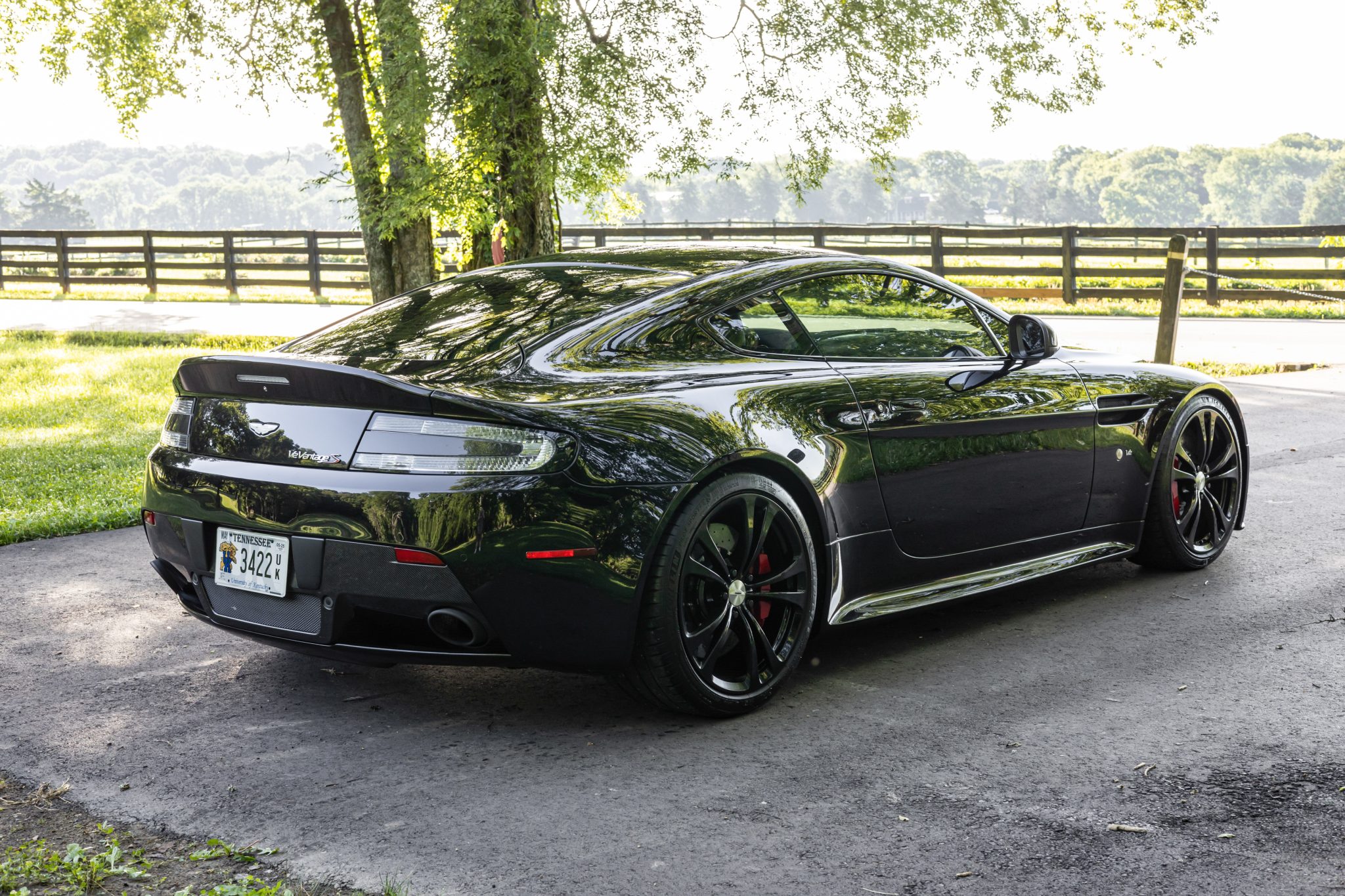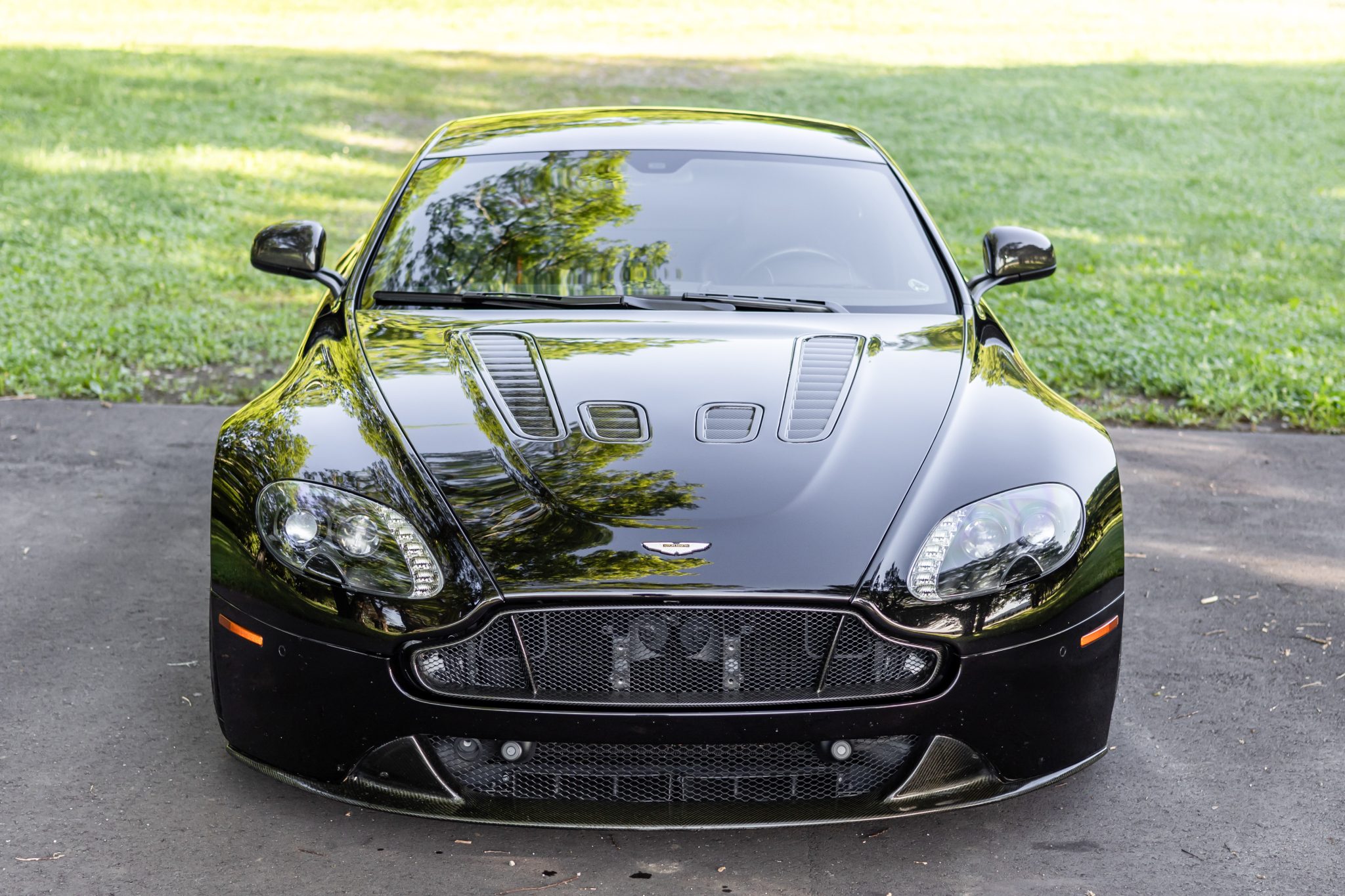 Black-finished 19″ multi-spoke alloy wheels have spacers and are mounted with 255/35 front and 295/30 rear Michelin Pilot Sport 4s tires. The car is equipped with Emergency Brake Assist (EBA), BC Racing coilovers, and Dynamic Stability Control (DSC). Braking is provided by red-finished Aston-Martin-branded calipers over carbon-ceramic two-piece rotors at all four corners.