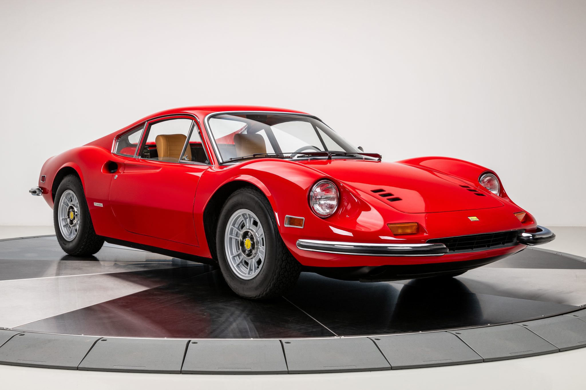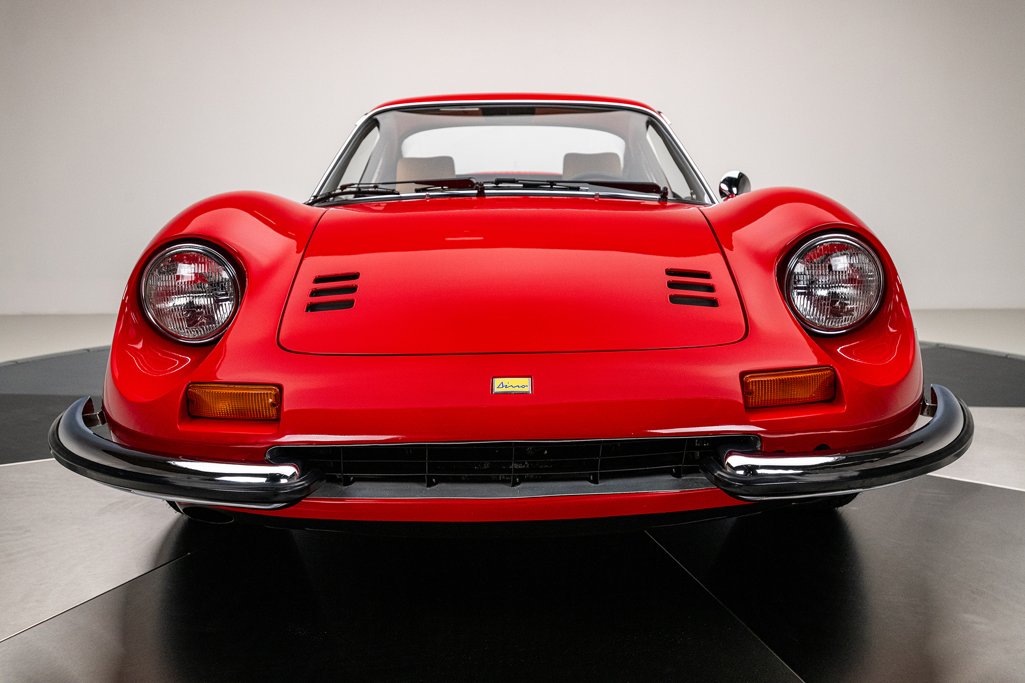 The 14″ Cromodora five-lug alloy wheels wear Dino-branded center caps and are mounted with 205/70 Michelin XWX tires that show date codes from 2023. A matching spare wheel is mounted in the front trunk. The suspension incorporates unequal-length A-arms, coilover Koni shock absorbers, and anti-roll bars at front and rear. Stopping power is provided by power-assisted ventilated disc brakes all around.