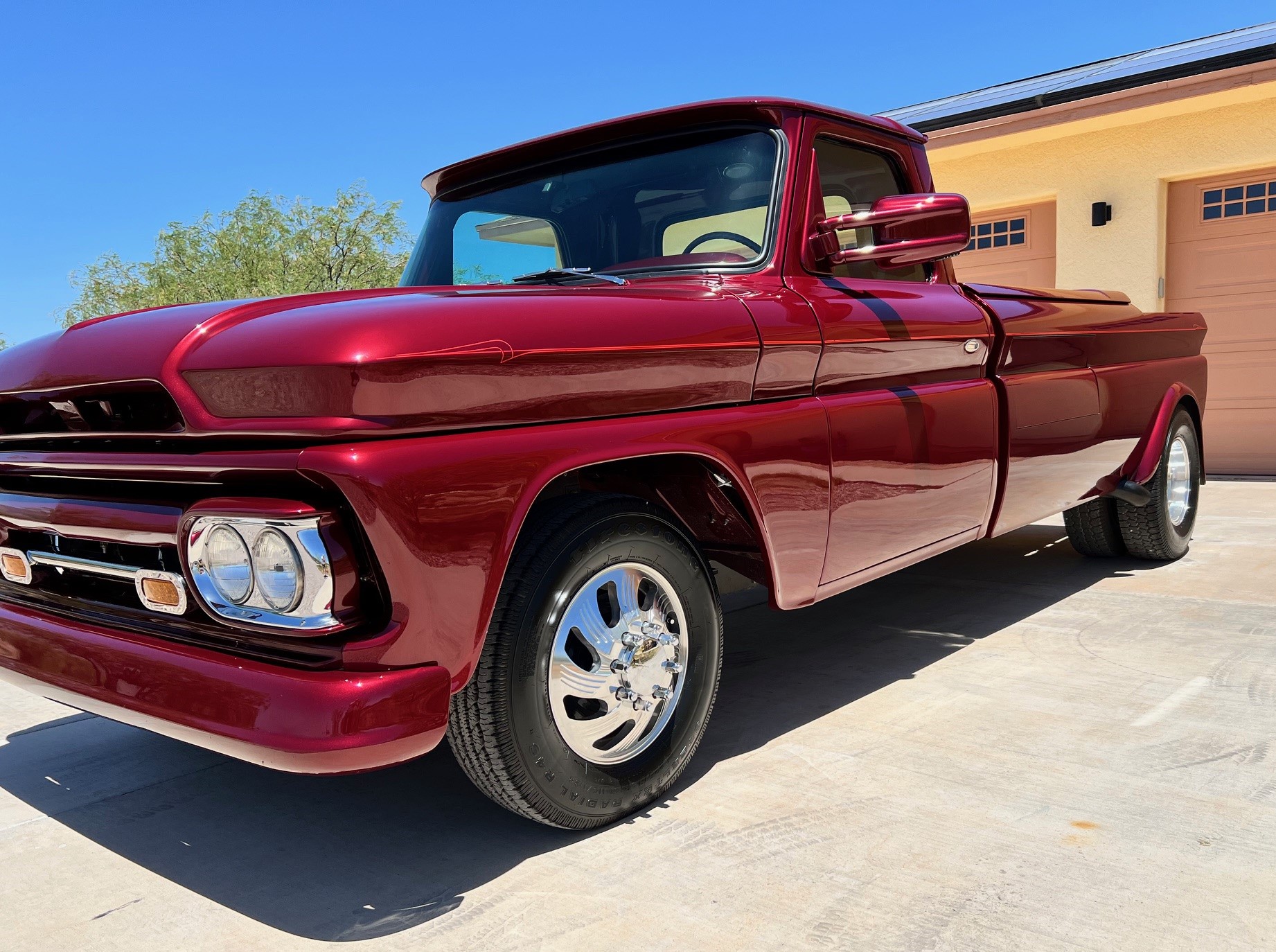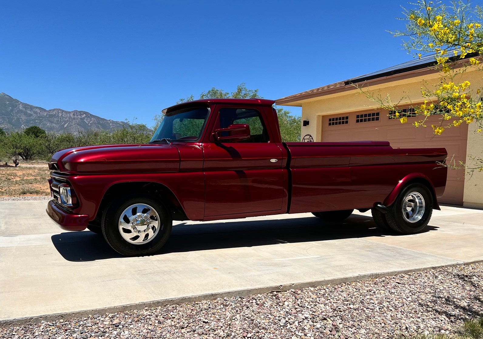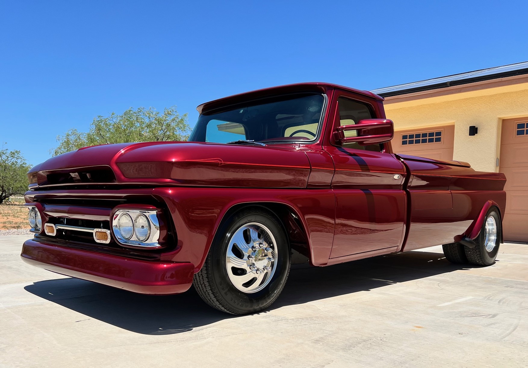 The front of the custom-fabricated bed features a tonneau cover, wood plank flooring, and power-actuated fuel filler access panels on both bedsides, while the rear is equipped with a fifth-wheel hitch and a compartment that houses a battery, battery shutoff, and air compressor.