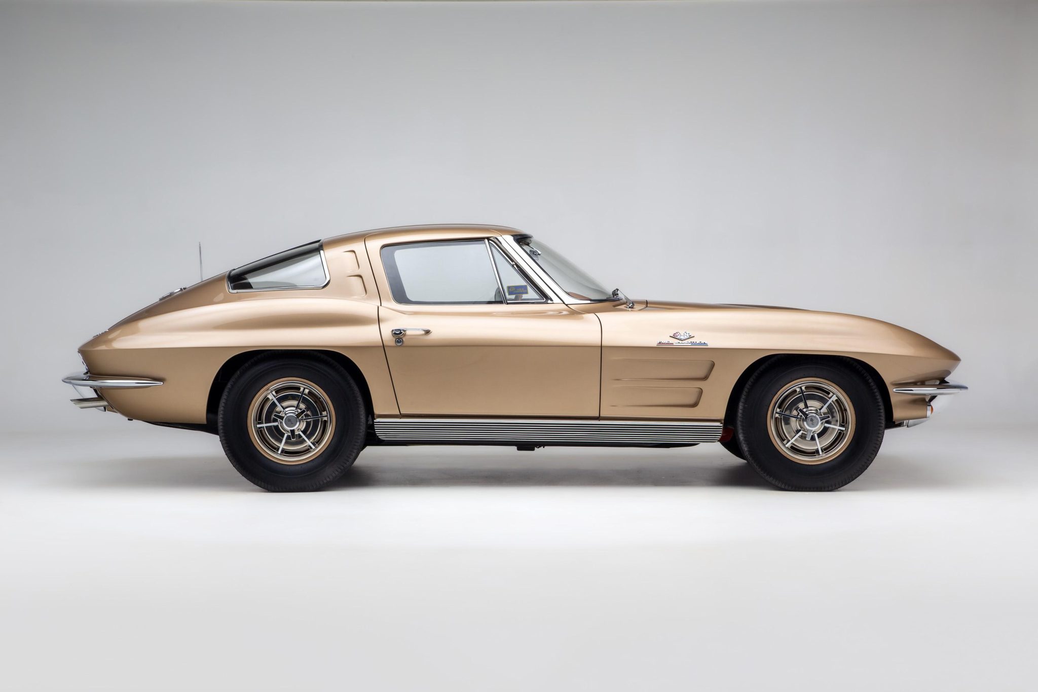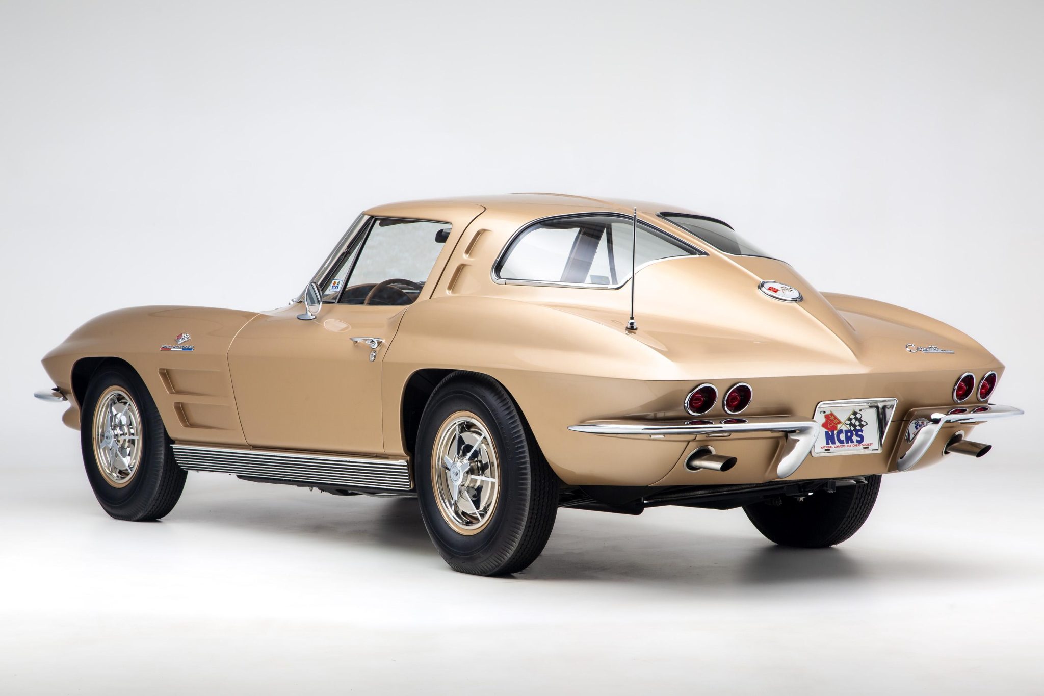 Silver-finished 15” steel wheels feature three-eared knock-off spinner-style hubcaps and are mounted with 6.70-15 Firestone tires. The C2 was the first Corvette to offer fully independent suspension, with upper and lower control arms at the front and a three-link setup with a transverse leaf spring at the rear. Braking is handled by four-wheel drums.