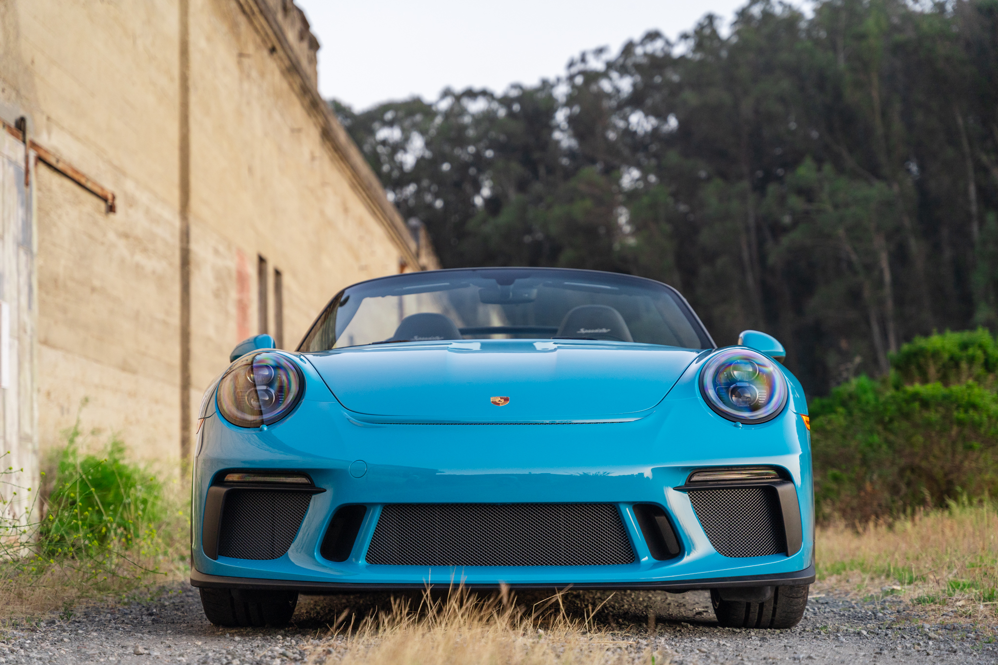 Center-locking 20″ forged alloy wheels are mounted with Dunlop Sport Maxx Race 2 tires measuring 245/35 up front and 305/30 at the rear. Braking is handled by four-wheel cross-drilled Porsche Ceramic Composite Brakes with yellow Porsche-branded calipers. Porsche Active Suspension Management (PASM), Porsche Stability Management (PSM), and rear-axle steering were standard on the Speedster, and this example was optioned with a front-axle lift system.