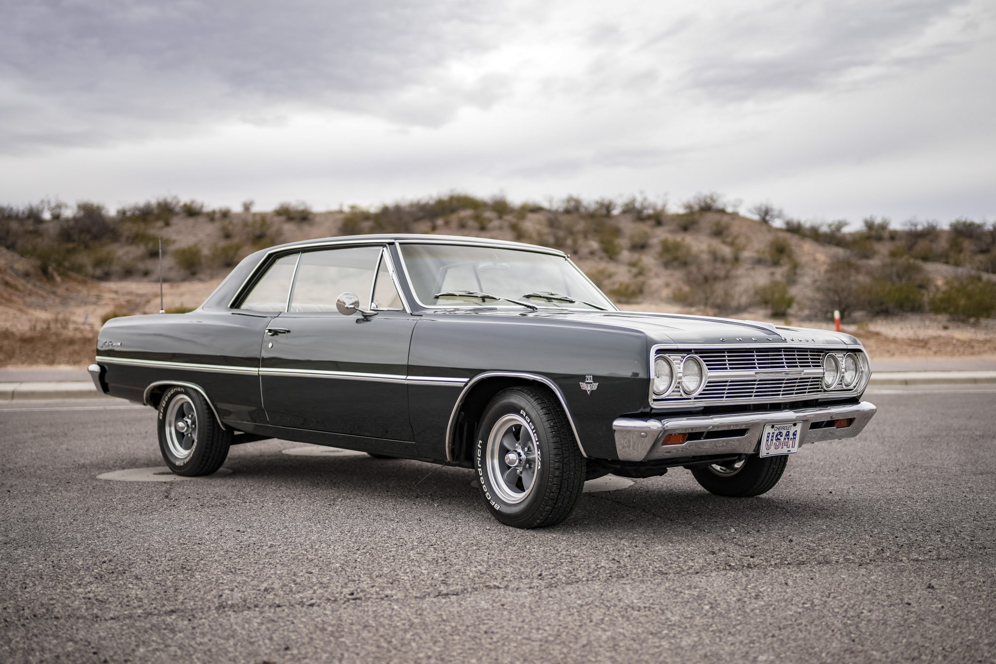 American Racing 14″ Torq Thrust D wheels are mounted with 205/70 BFGoodrich Radial T/A white-letter tires, and a full-size spare is stowed in the trunk. The rear coil springs were replaced in 2019. Stopping power is provided by a power-assisted drum setup that was installed in 2022, which included rebuilding the wheel cylinders.