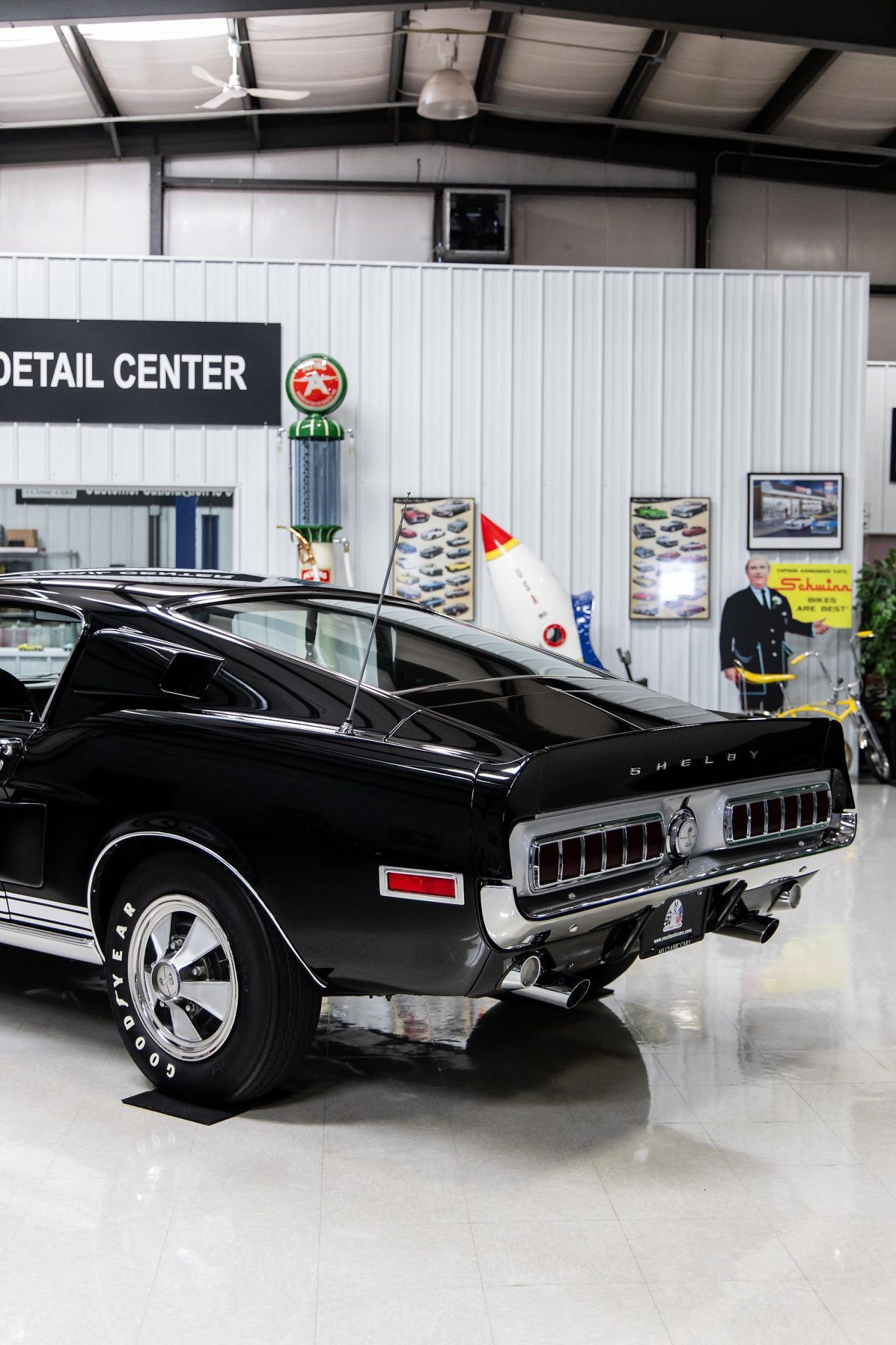 The 15″ wheels feature Shelby five-spoke covers and are mounted with Goodyear white-letter tires. GT500s were equipped with an upgraded suspension system with heavy-duty coil springs and an anti-roll bar up front in addition to heavy-duty leaf springs out back. The car is equipped with power steering, and stopping is provided by power-assisted front discs and rear drums. The rear lower shock bushings were replaced by the selling dealer.