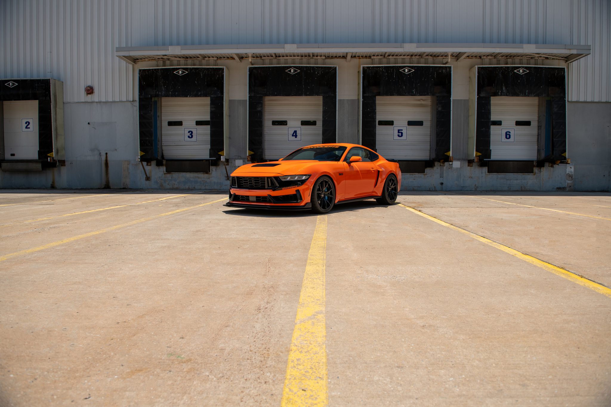 Staggered-width 20″ Forgestar CF5V wheels are mounted with 275/35 Mickey Thompson Street Comp front tires and 305/35 rear Mickey Thompson ET Street S/S rear tires, and they are affixed via six-spline aftermarket lug nuts. The suspension has been fitted with Roush Performance single-adjustable coilovers, which lower the ride height by approximately 1.5″ at the front corners and 1″ at the rear. Stopping power is provided by four-wheel disc brakes with blue-finished Brembo calipers featuring six pistons up front and four pistons out back.