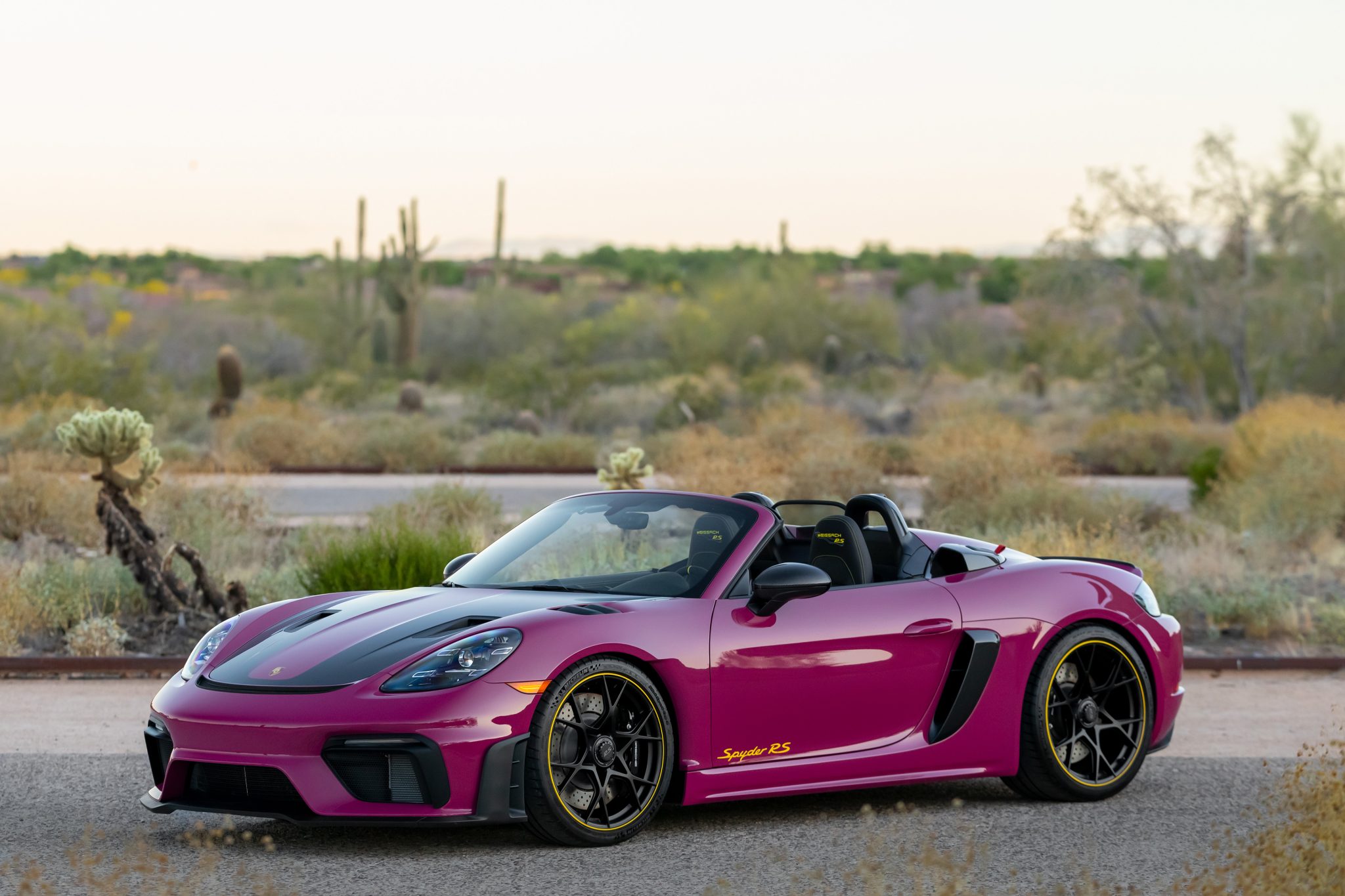 Satin Black-finished 20″ forged alloy wheels feature Racing Yellow accent stripes and are mounted with staggered-width Michelin Pilot Sport Cup 2 tires. A front-axle lift system was optioned from the factory, and stopping power is provided by four-wheel dimpled and ventilated discs with black-finished calipers.